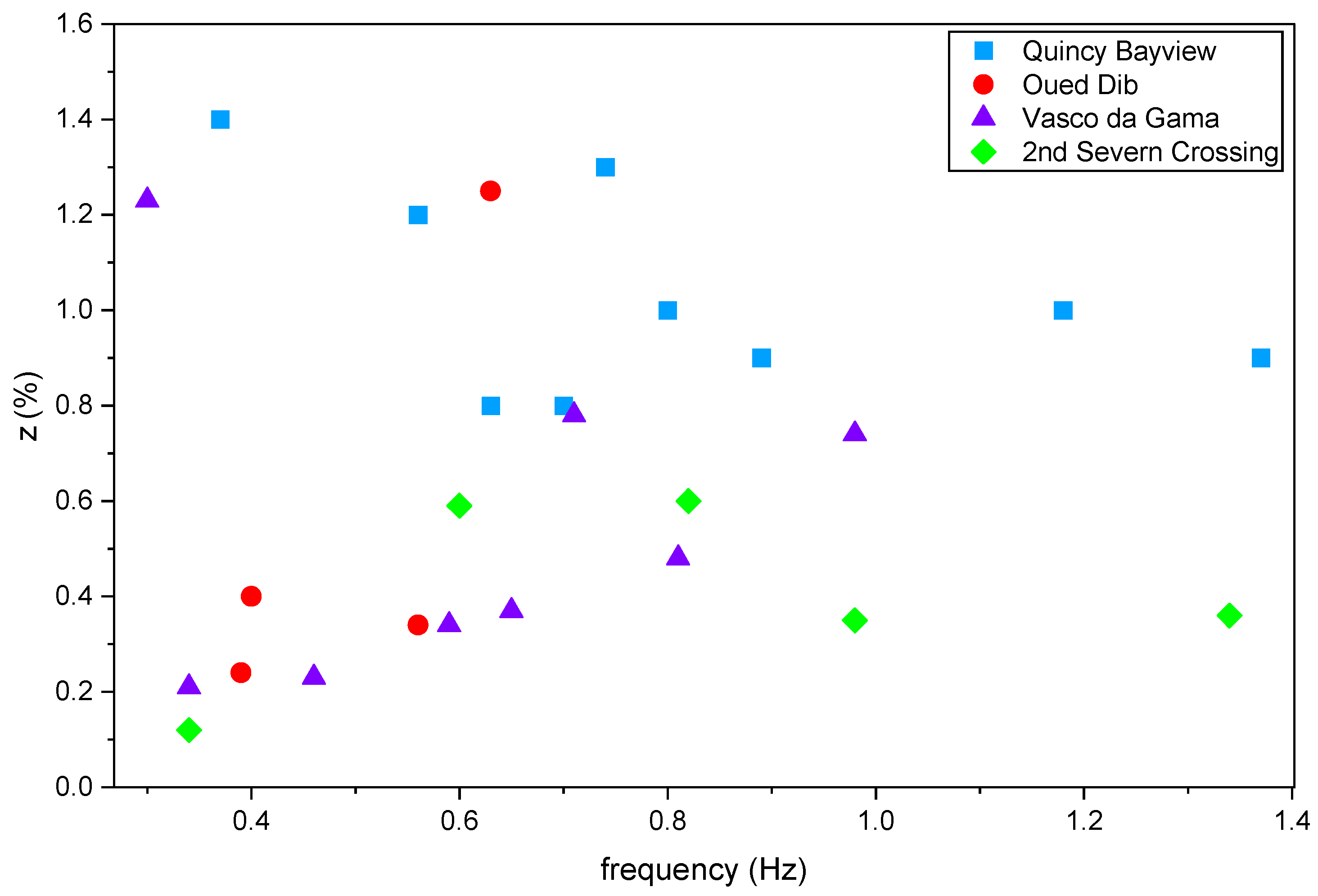 - Pridham, B.A.; Wilson, J.C. A reassessment of dynamic characteristics of the Quincy Bayview Bridge using output-only identification techniques. Earthq. Engng. Struct. Dyn. 2005, 34, 787–805. [Google Scholar] [CrossRef]