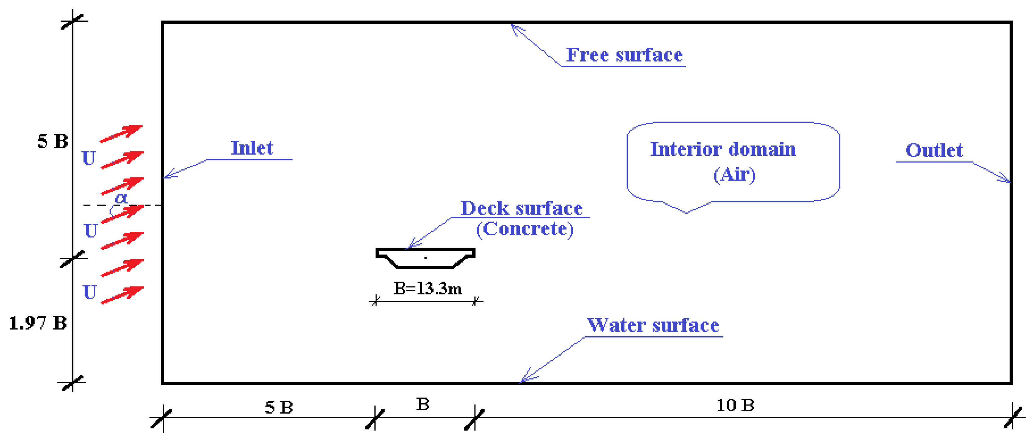 - CFD simulations of a two-dimensional deck section, subjected to a steady wind speed U = 20 m/s and varying angles of attack (AoA) from −10° to +10°, using the RANS k-ω SST turbulence model with a wall function Y+ = 30.