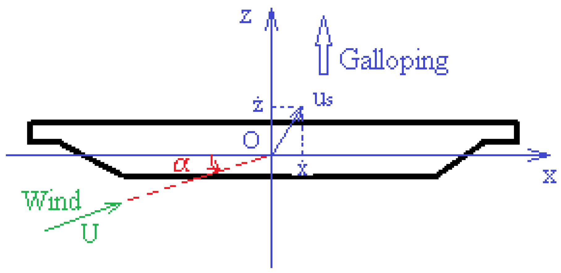 - Chen, C.; Mannini, C.; Bartoli, G.; Thiele, K. Experimental study and mathematical modeling on the unsteady galloping of a bridge deck with open cross section. J. Wind Eng. Ind. Aerodyn. 2020, 203, 104170. [Google Scholar] [CrossRef]