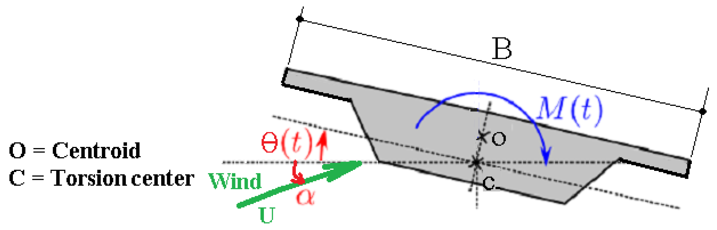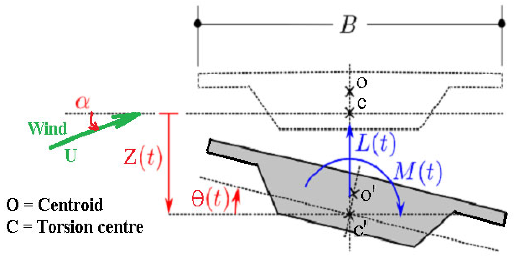 - Scanlan, R.H. The Action of Flexible Bridges under Wind, I: Flutter Theory. J. Sound Vib. 1978, 60, 187–199. [Google Scholar] [CrossRef]