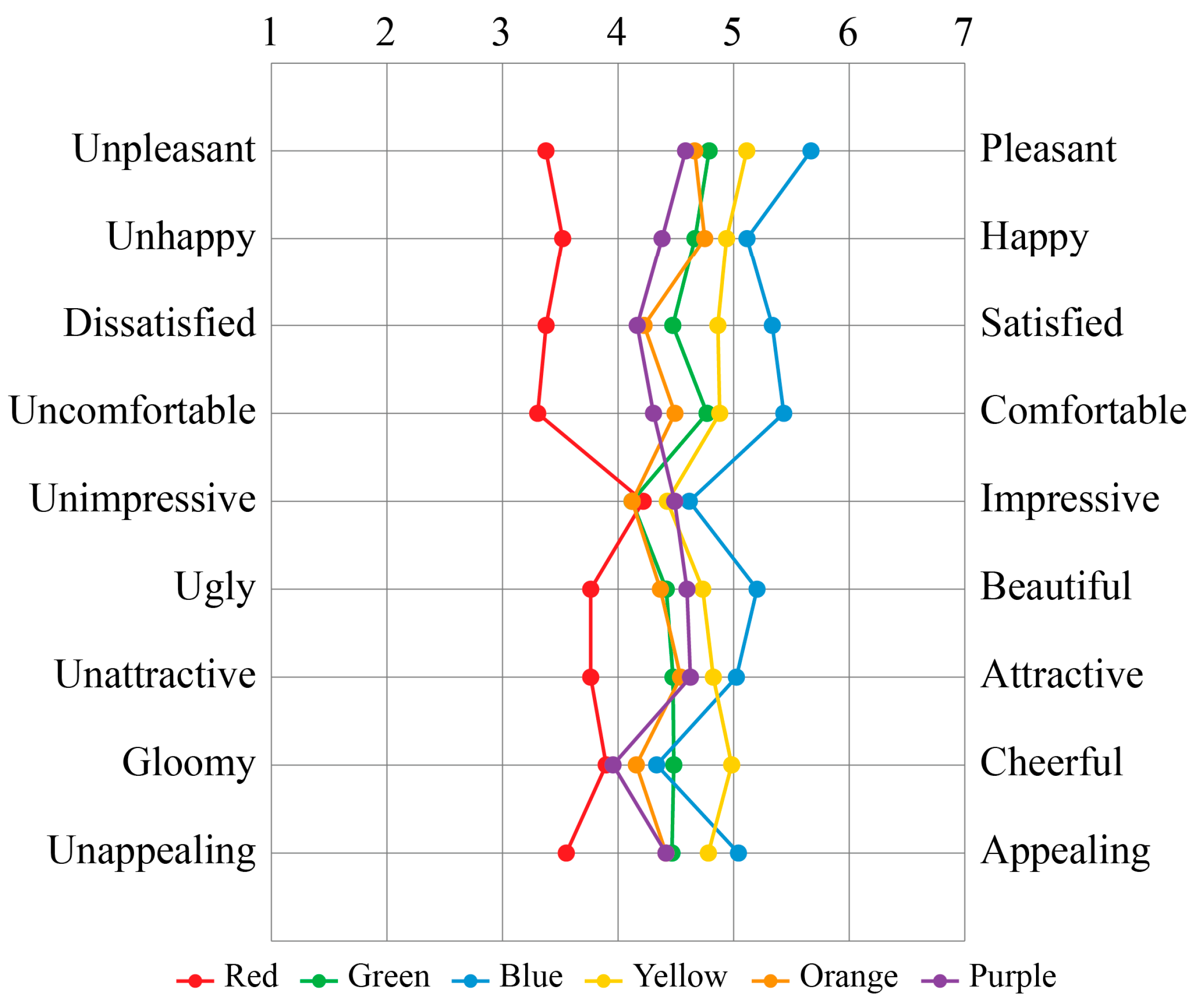 8]. Similarly, violet-colored interiors were perceived as more pleasant and spacious compared to yellow ones [