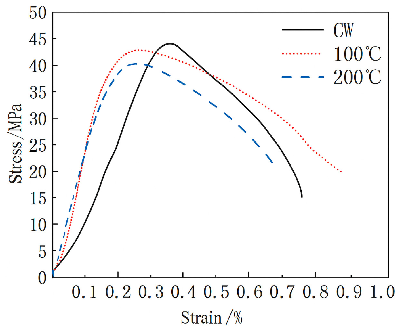 The uniaxial compressive stress–strain curves under three working conditions (normal temperature, 100 °C, and 200 °C) are shown in