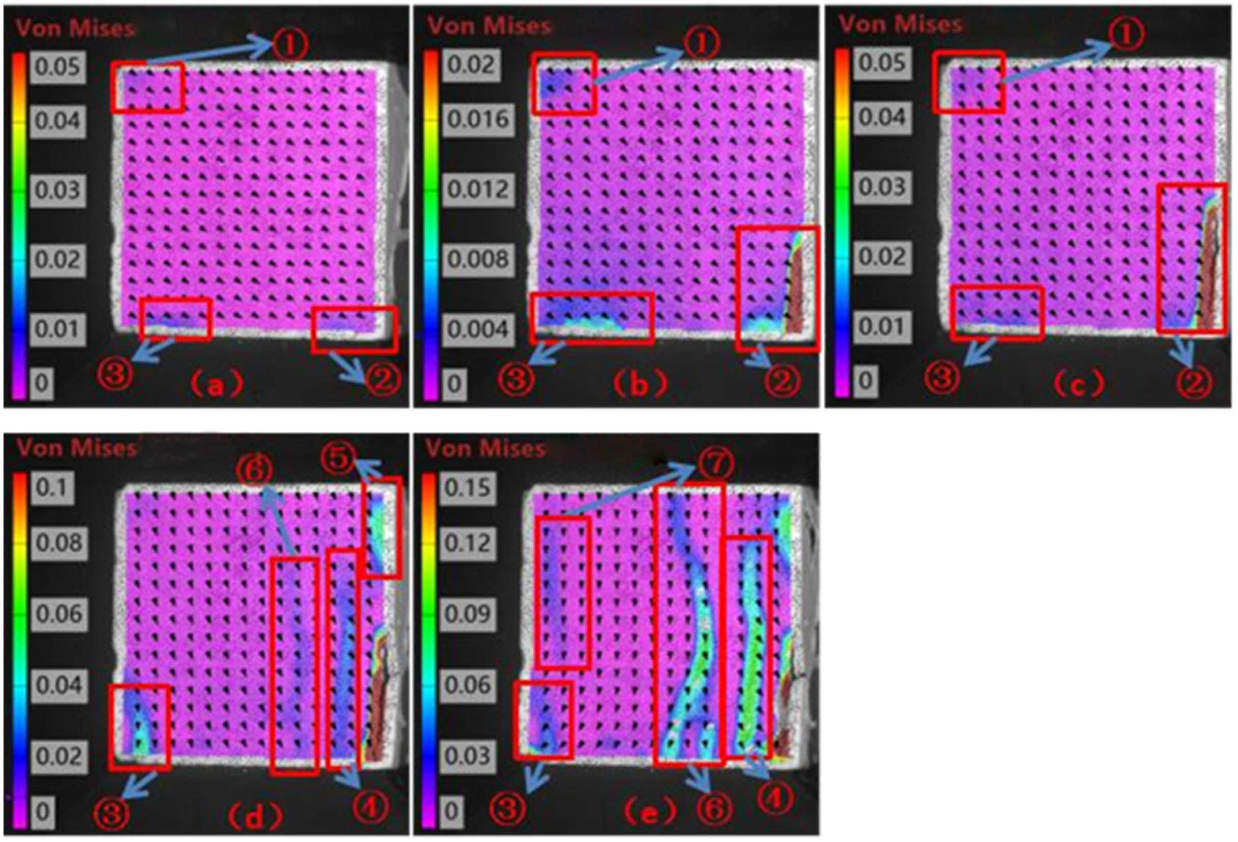Figure 5e), the strains in the main cracks ② and ③ increased suddenly to 0.48%, and secondary cracks ④ and ⑤ developed synchronously (strain 0.12%). The displacement field showed significant divergence characteristics in the crack regions (e.g., leftward at ② and ③, oblique separation at ④).