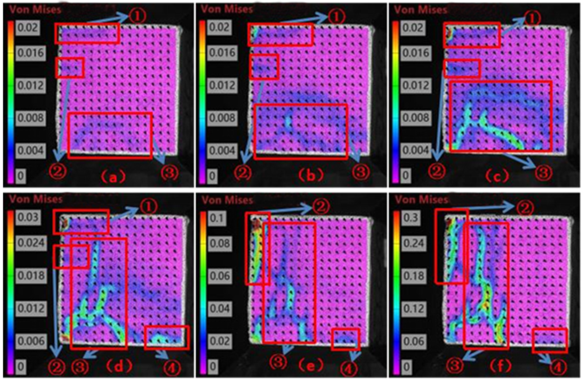 Figure 5a), the strain concentration appeared in the end region ① of the specimen (local strain 0.0125%), and the displacement field was dominated by horizontal leftward movement that reflected the stress concentration effect caused by end friction constraint. As the load increased (220 s,