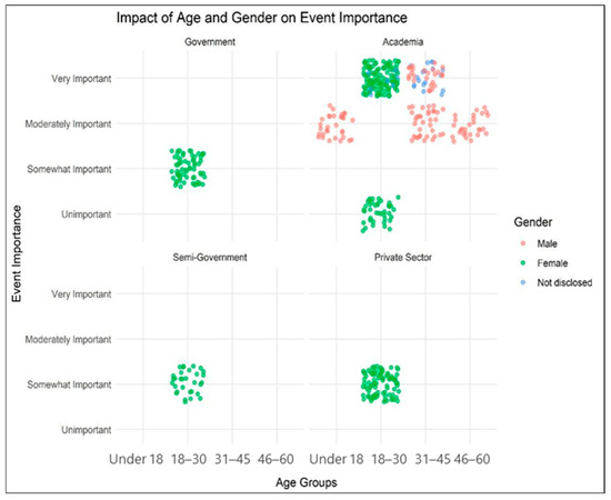 The characteristics of demographics strongly influence how city residents perceive public events together with their level of involvement. Preferences for public events strongly depend on three essential demographic variables that include age, gender, and professional work experience. Youth within the age range of 18 to 30 years show interest mostly in entertainment and cultural events, but adults ranging from 46 to 60 years choose religious and community-focused gatherings (Figure 2). Participants make their event selections using a gender-biased approach that shows distinct behavioral patterns between male and female attendees. The employment sector where people work either in government or private sectors or academia determines what types of experiences employees desire from events. The analysis demonstrates why planners must plan events specifically for various audience preferences within the community.