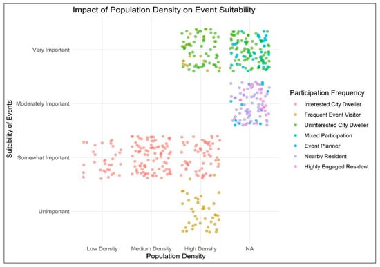 Correlation analysis further illuminated how various factors influence the functionality of public events. The study revealed significant insights tied to age, with older respondents showing a greater preference for religious and community-building activities, whereas younger respondents favored entertainment and cultural events. Occupation also played a role; public sector employees tended to select cultural events, while private sector workers preferred commercial and entertainment themes. Additionally, the analysis indicated that workers, in general, prefer evening events to accommodate their professional schedules. These findings are consistent with existing literature, underscoring the necessity for event organizers to consider demographic characteristics when planning to meet diverse community needs [31,47,48]. The analysis also highlighted that population density within a neighborhood impacts event suitability, influencing both accessibility and noise concerns due to increased traffic and limited space in dense areas [35]. Event planners must balance resource management with enhanced visibility to create effective and inclusive events. These results are in line with research on place attachment, where individuals’ emotional and behavioral connections to public spaces are shaped by their life stage, social identity, and cultural expectations [35,36,47,49].