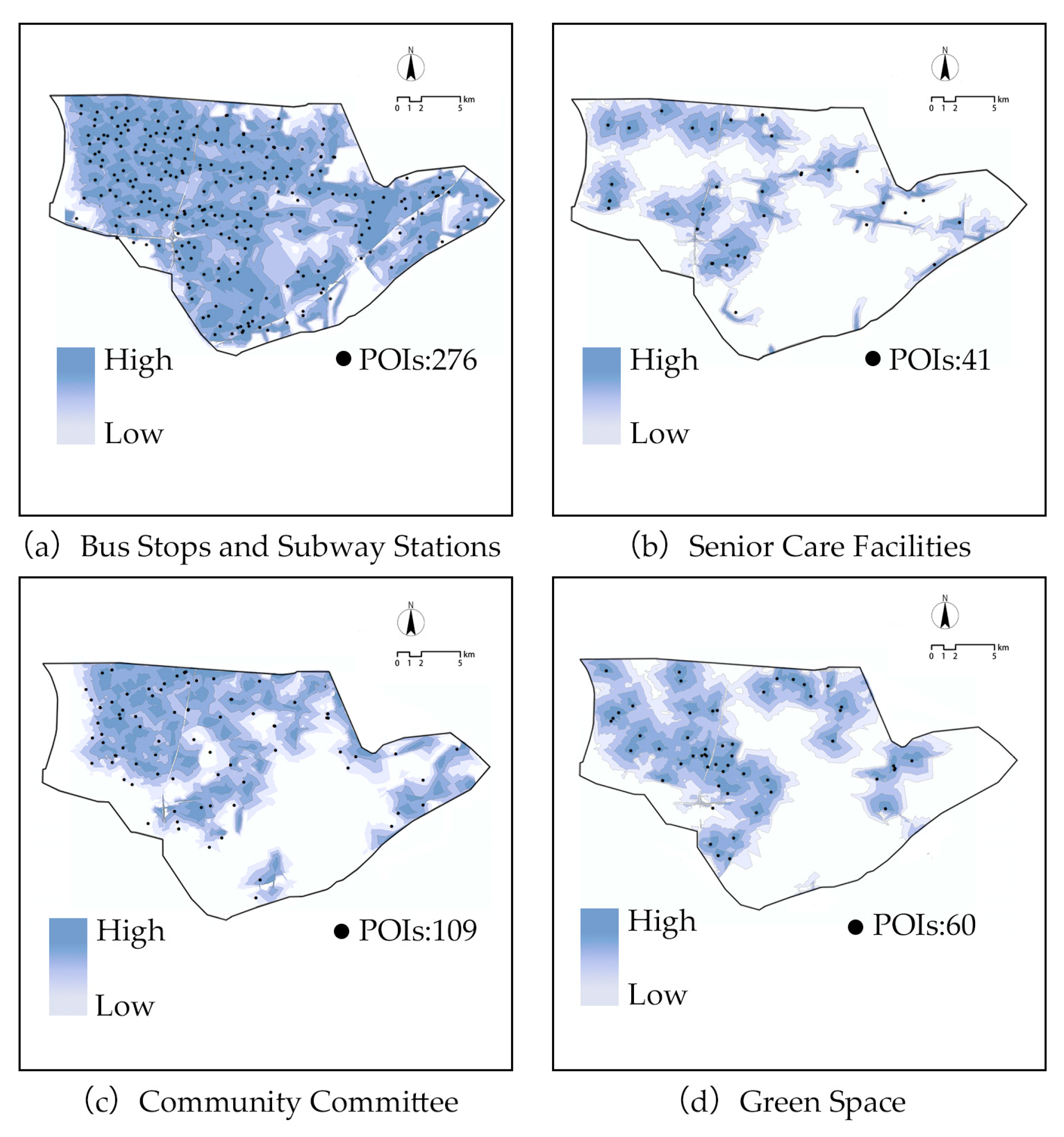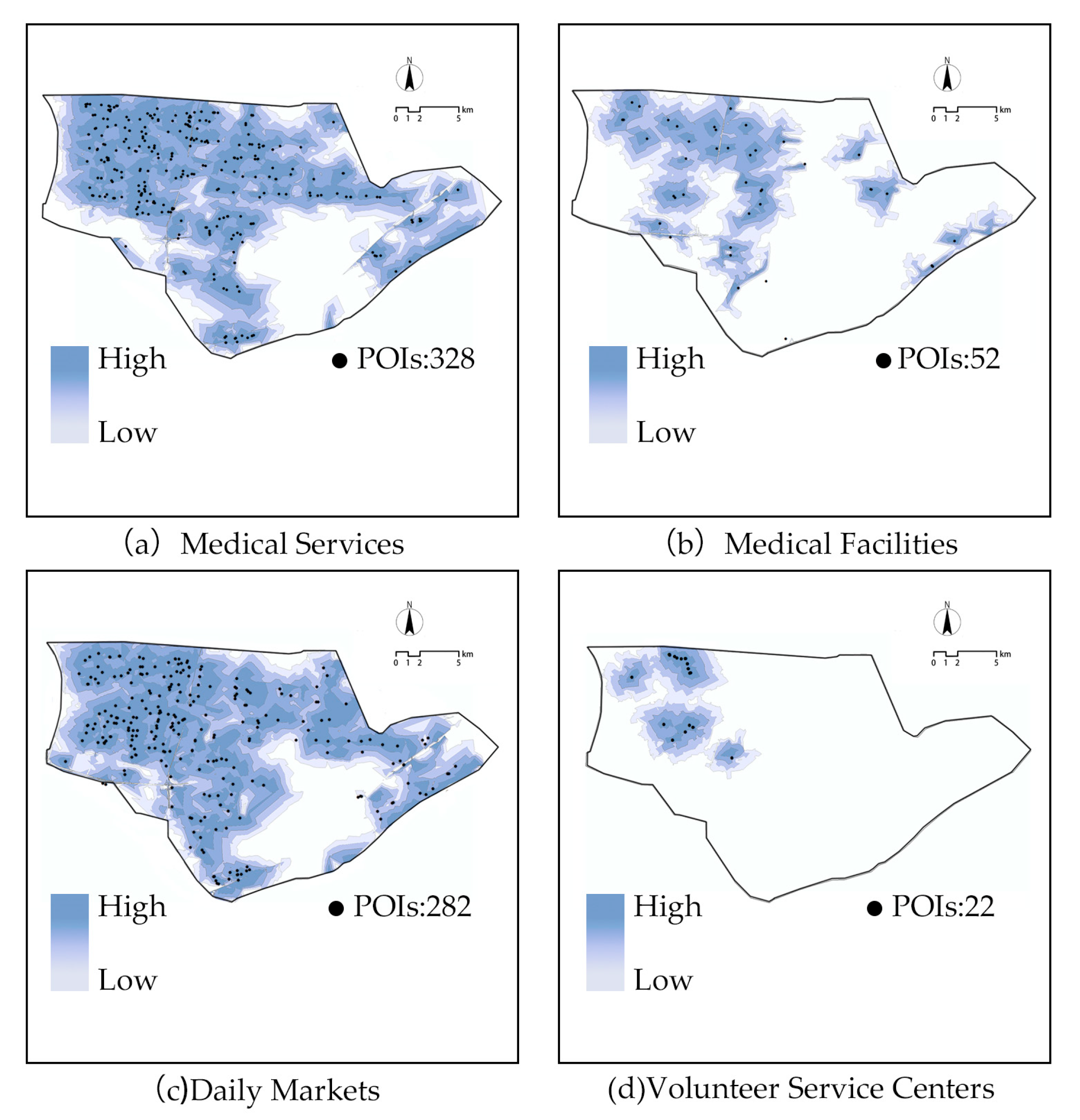 3.4.2. Accessibility and Kernel Density Analysis Based on POI Data