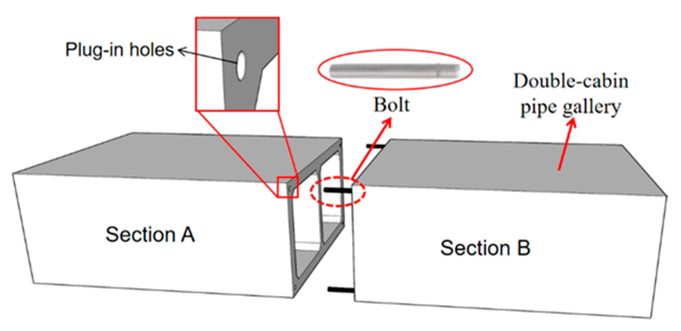 - Duan, X.; Dong, Q.; Ye, W. Experimental study on seismic performance of prefabricated utility tunnel. Adv. Civ. Eng. 2019, 2019, 8968260. [Google Scholar] [CrossRef]