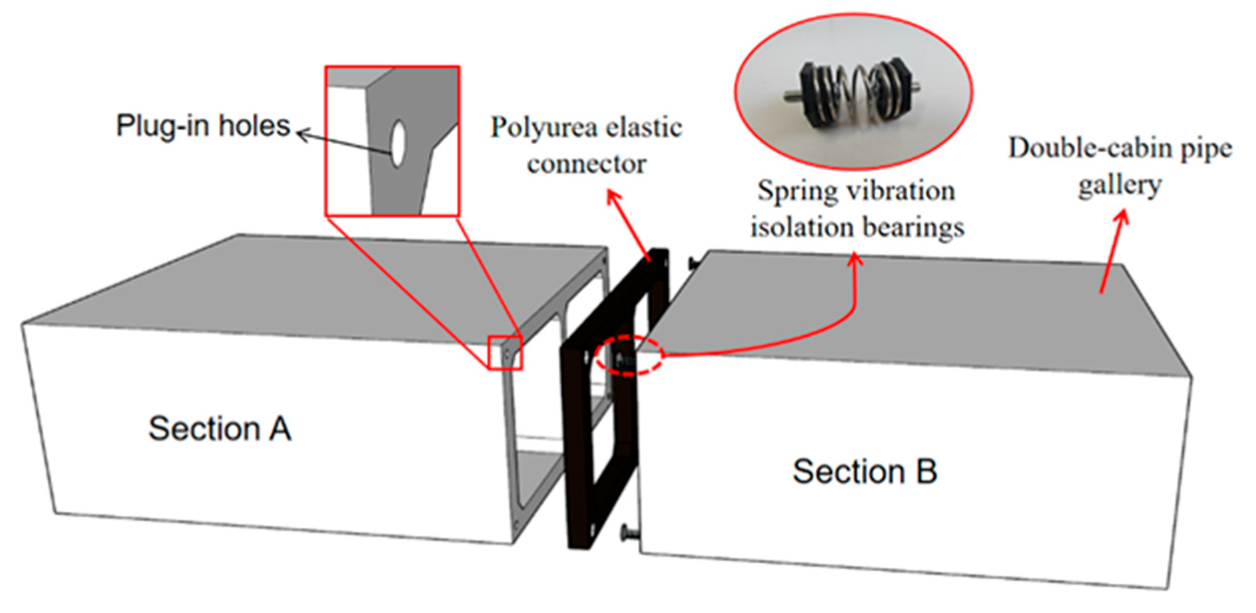 - A flexible-connection node of “skin-tendon” for the pipe gallery structure has been proposed. The node is composed of an “outer skin” made by a polyurea grouting slurry and an “inner rib” composed of the spring vibration isolation bearing.