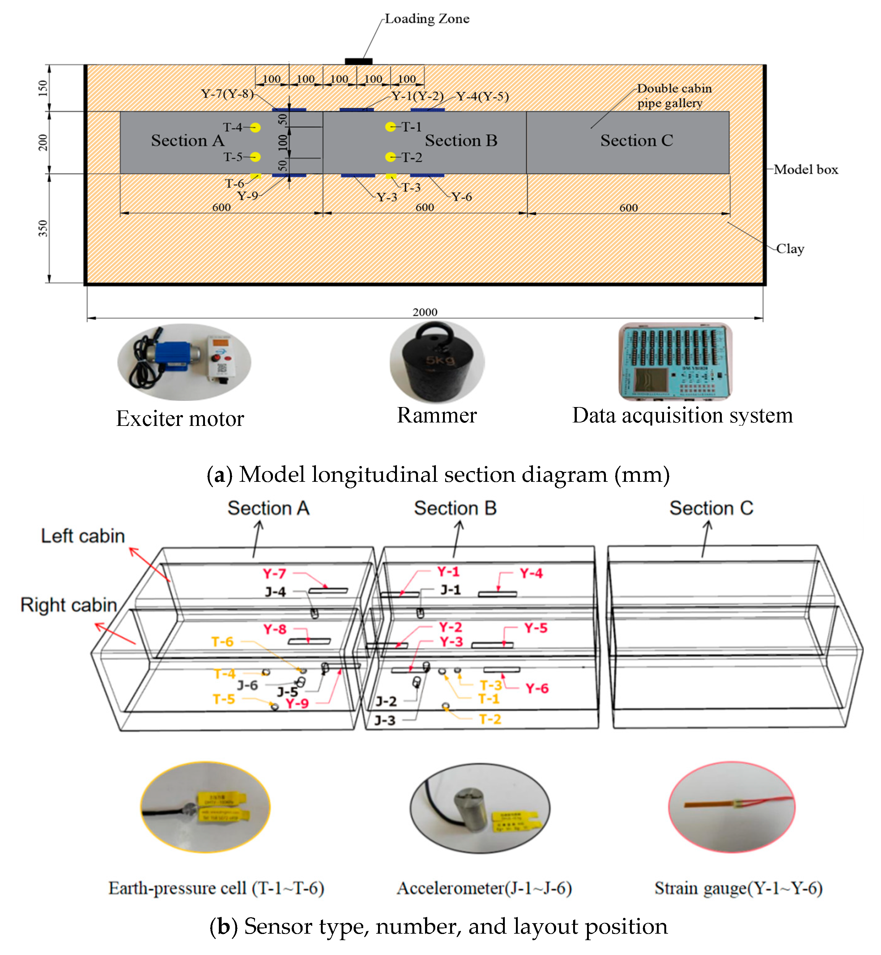 - Deng, B.; Zheng, X.; Shen, C.; Fu, Y. Study on dynamic response characteristics of shallow buried pipe gallery structure under vehicle vibration load. Soil Dyn. Earthq. Eng. 2024, 181, 108597. [Google Scholar] [CrossRef]