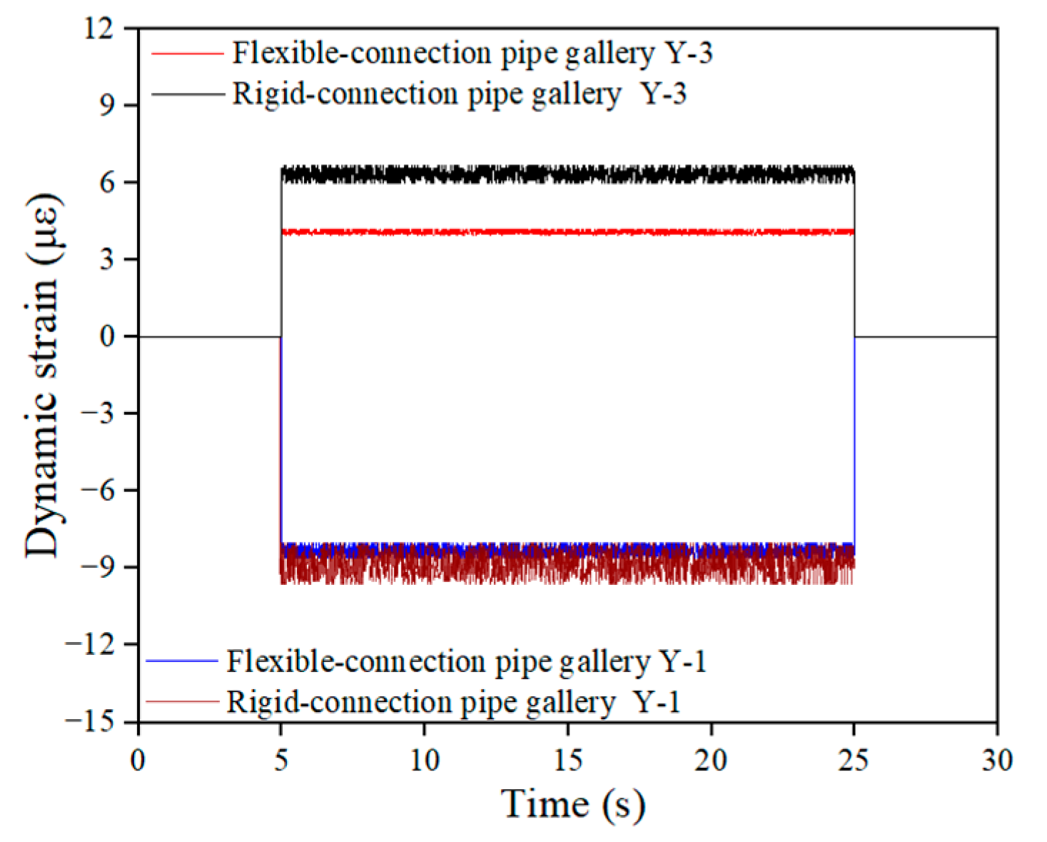 - Although this study incorporates bionic principles, verification for the self-recovery capability of flexible-connection nodes after vibration is also lacking. The current sensor layout mainly focuses on capturing global strain responses, and energy dissipation during load propagation is neglected. To capture energy changes in the underground pipe gallery accurately during load propagation, the installation distance between sensors should be reduced. These improvements will bridge the gap between the model test and engineering practice and provide guides for the design of underground pipe gallery structures more effectively.