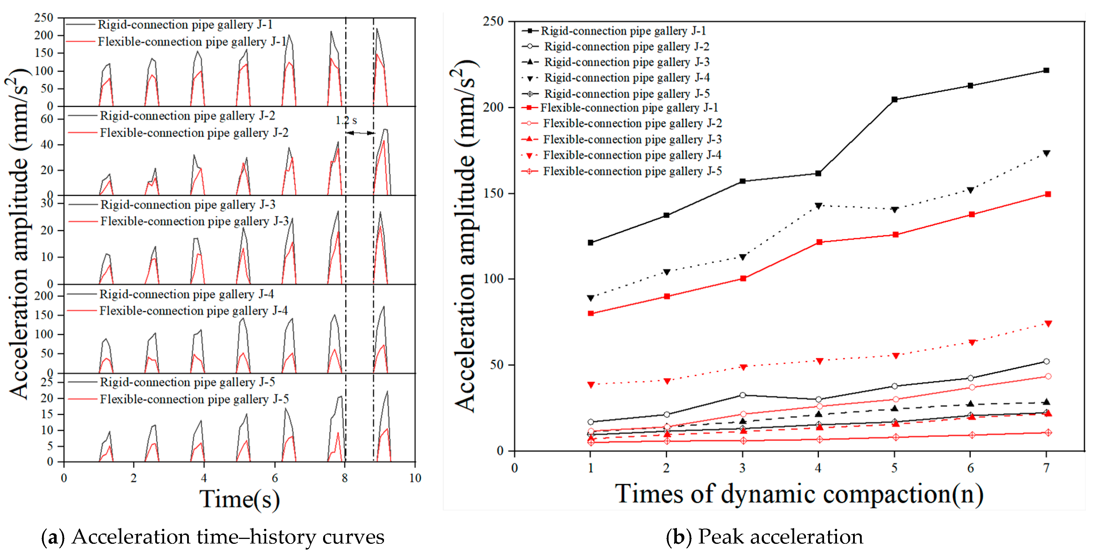 - Under dynamic compaction, the maximum attenuation rates of acceleration and the dynamic strain of flexible-connection nodes are 51.4% and 42.2%, respectively, while those of rigid-connection nodes are only 21.5% and 14.6%, respectively. Under machine vibration, the maximum attenuation rates of acceleration and the dynamic strain of flexible-connection nodes are 72.6% and 60.4%, respectively. However, those of rigid-connection nodes are only 24.1% and 11.1%, respectively.