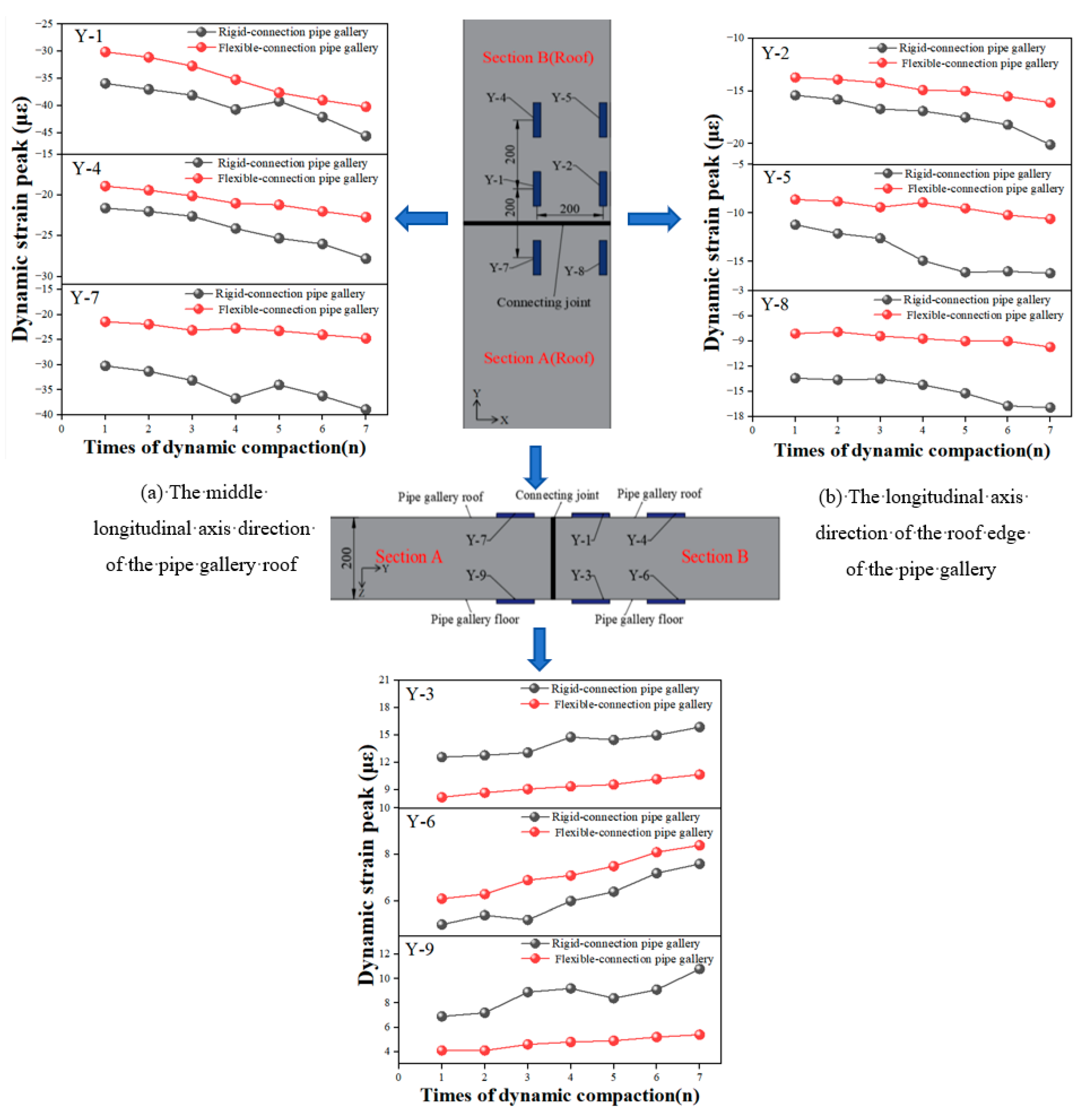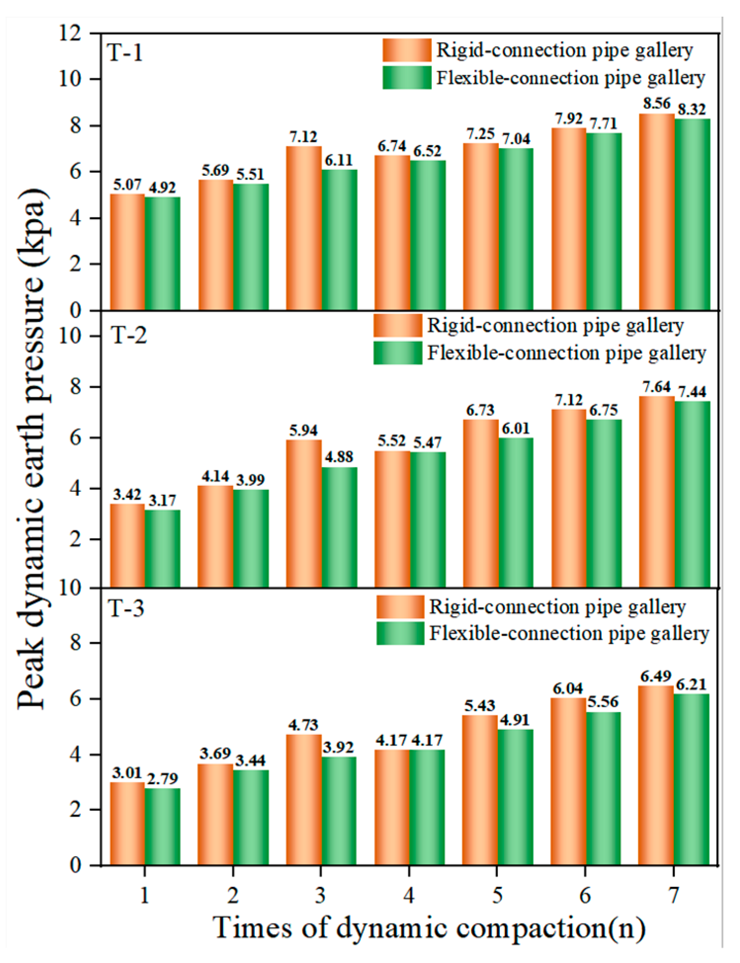 - Under identical load conditions, the earth pressure measured at the pipe gallery structure with flexible nodes is smaller than that with rigid nodes, with a reduction range of 2.2–7.9%. Additionally, dynamic compaction generates residual earth pressure, leading to increased pressure on the side walls of the pipe gallery. Therefore, the reinforcement ratio of the pipe gallery structure should be increased to enhance the load-bearing capacity.