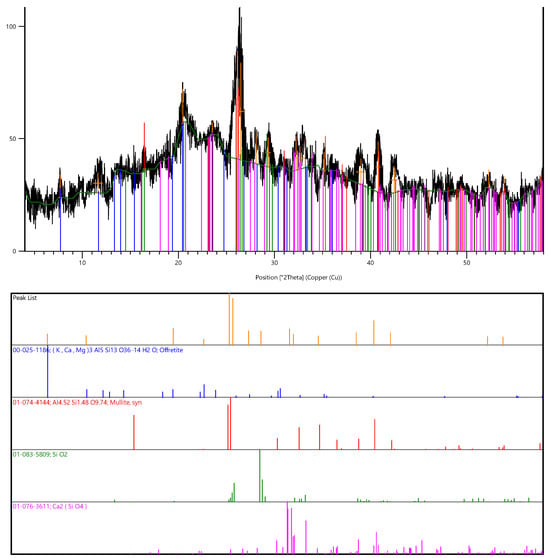 - ettringite (Ca6Al2(SO4)3(OH)12·26H2O) d/n—8.7513; 5.6607; 4.6988; 3.6671; 3.4901; 2.5654; 2.4769 Å;