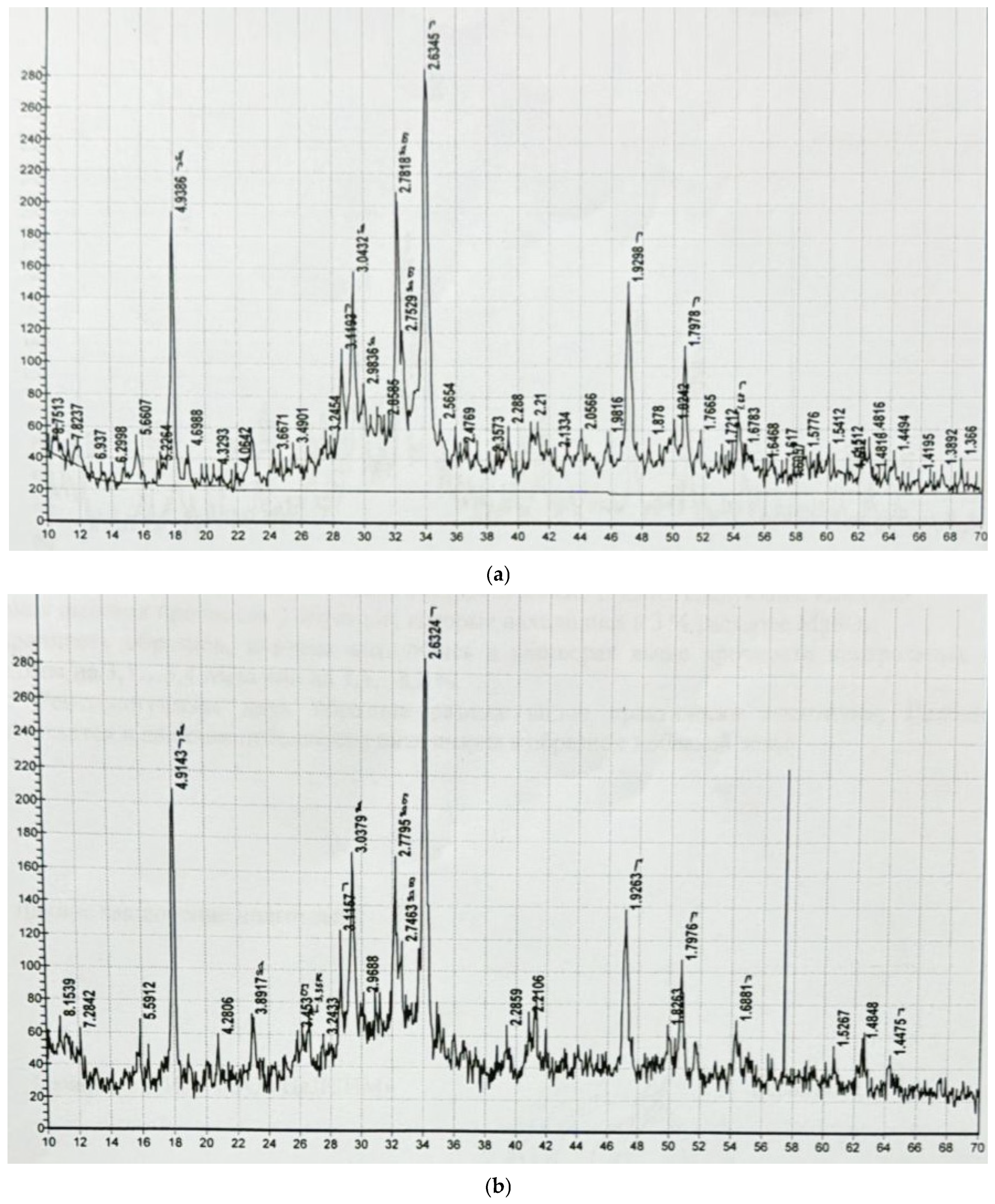 - Yesimov, B.O.; Adyrbaeva, T.A.; Zhakipbaev, B.E. X-ray determinant of minerals V.I. Mikheeva. In Methodological Instructions for Universities; M. Auezov SKSU: Shymkent, Kazakhstan, 2012; p. 164. [Google Scholar]