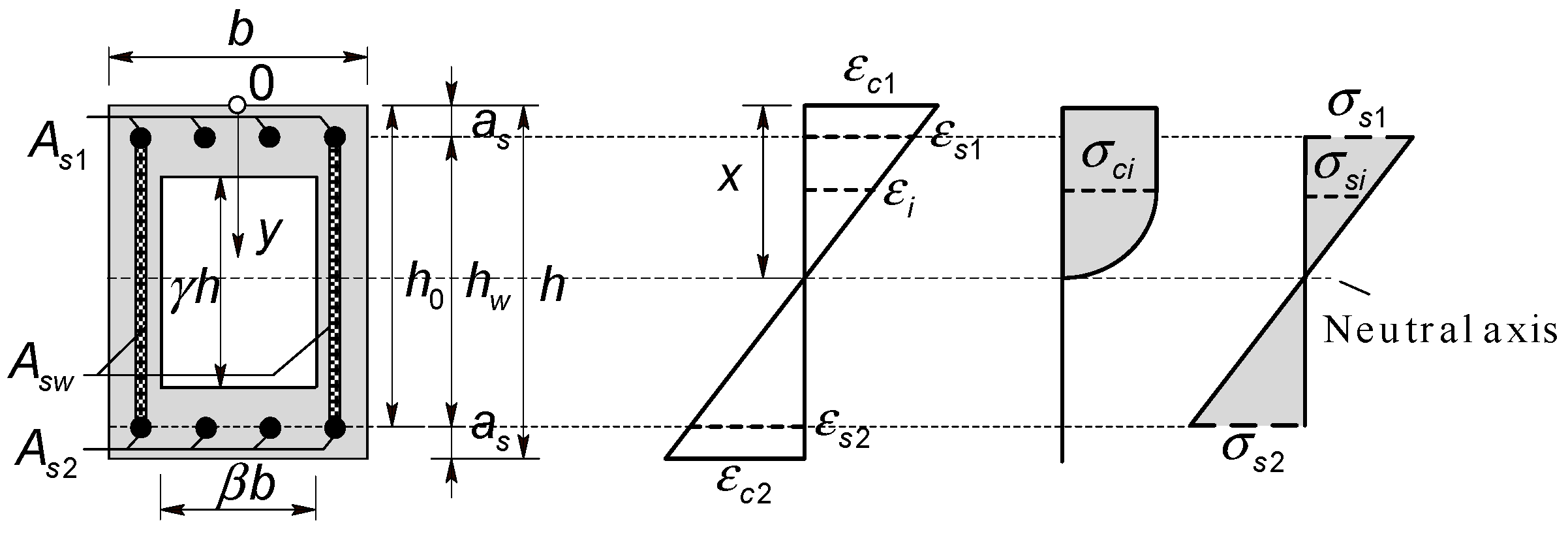 - The webs: to simplify the calculation, the scattered reinforcing steels are simplified into reinforcing steel strips with the same area as the original reinforcing steels, as shown in Figure 3. The per unit length area of the reinforcing steel strips can be written as follow: