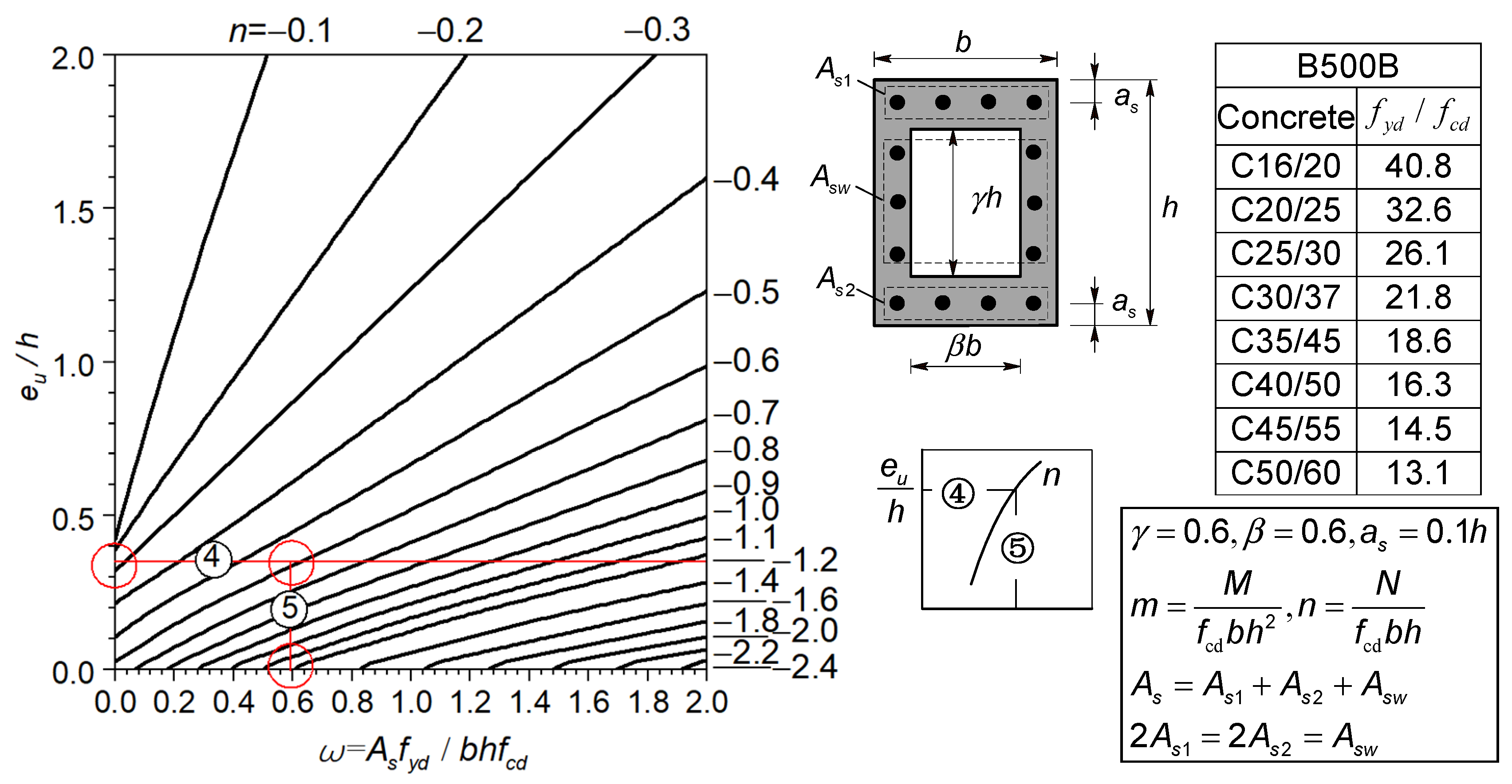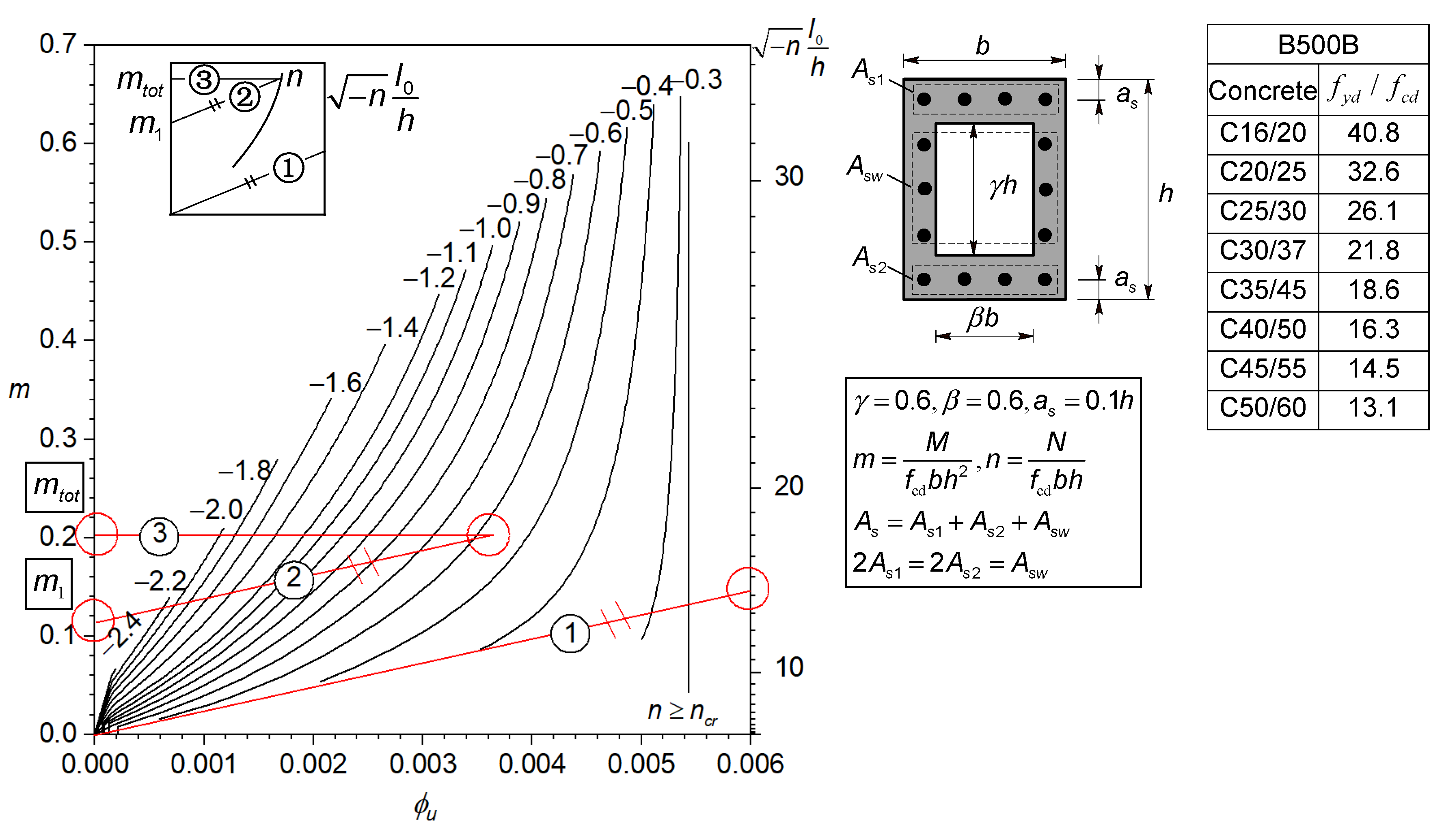 - Calculate using the nomogramsFirst-order dimensionless eccentricity is:Normal relative force is:Dimensionless first-order bending moment is: