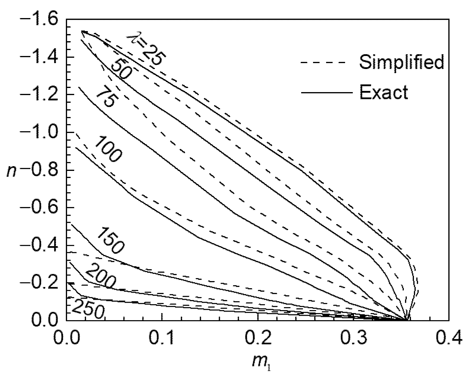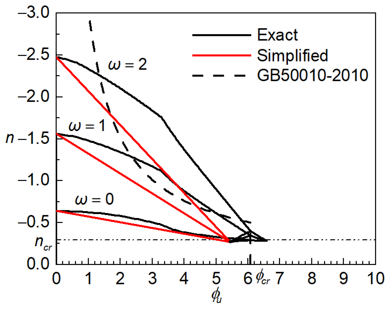 - The part of internal resistance: each value of n is selected from −0.1 to −2.4 and is fixed, then we let increase from 0 to 2 with the steps of 0.01, thus of the cross-section can be calculated with calculation methods presented in Section 2.6, and the simplified dimensionless ultimate curvature can be calculated by Equation (24). Curves can be drawn with as the abscissa and as the ordinate, as shown in Figure 10.