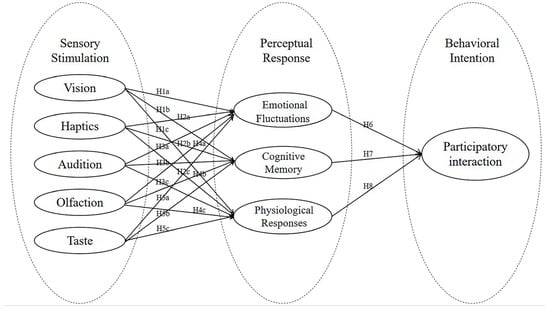 This study draws on the structural model of sensory marketing theory, originally developed in commercial consumption contexts, and introduces it for the first time into research on public art and resident behavior. Public artworks are conceptualized as aesthetic products, and sensory marketing theory is applied to examine how external stimuli activate human senses, generate diverse perceptual responses, and increase the frequency of interaction between people and artworks. This cross-disciplinary integration provides both an innovative pathway and a more practical theoretical foundation for public art research. Building on the sensory marketing framework, this study also draws on the SOR model, originally proposed by Mehrabian and Russell [48]. Within this SOR paradigm, perceptual responses (comprising emotional fluctuations, cognitive memory, and physiological reactions) are considered key mediators in the relationship between sensory stimuli and behavioral outcomes. Accordingly, this study constructs a model (Figure 1) in which stimuli from the five senses serve as independent variables, and the intensity of perceptual responses is measured through emotional, cognitive, and physiological dimensions. These perceptual responses are then assessed as mediating variables to evaluate the impact of multisensory public art stimuli on the public’s willingness to engage and participate.
