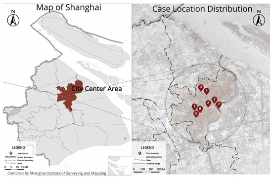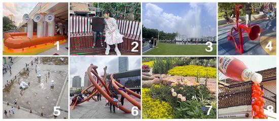 This study selected eight public art installations, each representing one of the five sensory dimensions, as case references (Figure 2). We prioritized works with independent sensory attributes (some accompanied by necessary visual cues) to distinguish the varying effects of each sense on interaction. All cases are located in Shanghai’s central districts, Cases 2, 3, 4, and 6 in Jing’an, and Cases 1, 5, 7, and 8 in Changning (Figure 3). Jing’an, the historic city center of old Shanghai, retains rich architectural heritage, with dense population, convenient transport, and diverse cultural and commercial facilities, making it highly suitable for studying resident behavior. Adjacent to Jing’an, Changning has become a key demonstration area of Shanghai’s recent micro-renewal practices, offering numerous examples of art-based community interventions that support this research.
