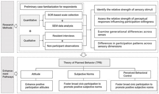 Meanwhile, based on the questionnaire survey, this study also collected participation experiences and evaluations from 15 respondents at the case sites. The content focused on residents’ first impressions of the artworks, participation motivations, sensory experiences, and emotional fluctuations. These evaluations were used to further verify the hypothesized relationships mentioned above. In addition, non-participant observations conducted by the research team were incorporated to identify preference differences across groups and behavioral variations resulting from different types of Sensory Stimulation. As a contextual supplement to the quantitative findings, this section aims to provide a more comprehensive understanding of the complex behavioral patterns and underlying psychological mechanisms between Sensory Stimulation and residents’ participation behavior. Finally, the study summarizes the data, evaluations, and observations to propose implementation recommendations and optimization pathways guided by the TPB (Figure 4).