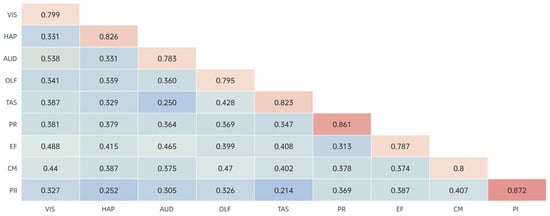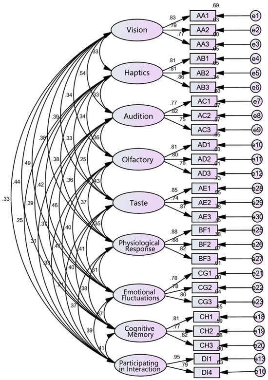 The results from Cronbach’s reliability analysis indicate that the scales for sensory stimulation, perceptual response, and behavioral intention, as well as their internal dimensions, demonstrate good to excellent internal consistency (Table 2). The total Cronbach’s α coefficient exceeds 0.9, suggesting that respondents’ perceptions of the scale dimensions, or how public art is influenced by these dimensions, show robust and reliable characteristics. This also indicates that the responses obtained from the questions in measuring these dimensions are consistent, providing a reliable foundation for the subsequent research work.