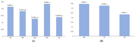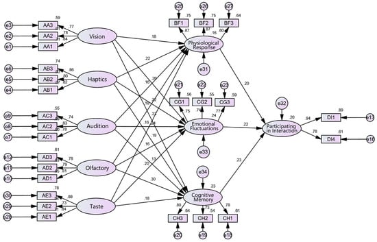 In the context of community public art, multisensory cues collectively shape both the physical and perceptual environment of users. Different senses follow distinct perceptual pathways. First, visual factors such as the size, form, and color of public artworks influence emotions and aesthetic cognition. Numerous studies have confirmed the impact of visual art on mood and emotional states [69,70,71]. The inclusion of this hypothesis provides a reference for other senses and serves to validate the model. Second, audition and olfaction function as independent senses that can operate without visual support. Auditory stimuli are often used to regulate emotions, with observable variables including natural sounds, music, and human voices, and are hypothesized to have positive effects on participants’ emotions and cognition. Olfaction, strongly linked to memory, is represented by observable variables such as the scents of food, plants, or artificial blends, and is reasonably assumed to directly influence cognition and emotion. Third, haptics and taste usually depend on visual guidance, as material textures, temperature and humidity, or food associations evoke bodily and psychological perception.