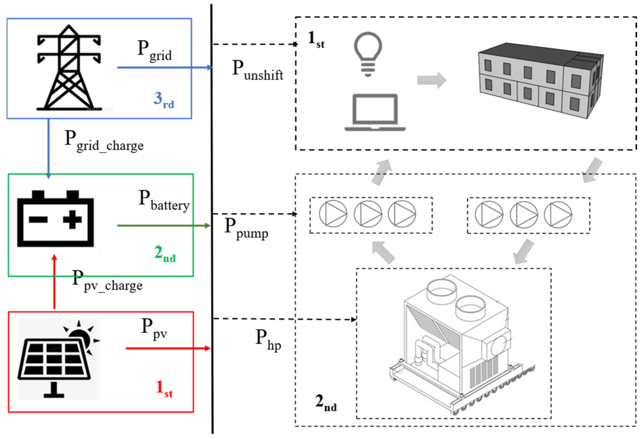 - Li, Y.; Lu, Y.; Sun, J.; Wang, T.; Zong, S.; Zhou, T.; Wang, X. Operational Strategy of a DC Inverter Heat Pump System Considering PV Power Fluctuation and Demand-Side Load Characteristics. Buildings 2024, 14, 1139. [Google Scholar] [CrossRef]