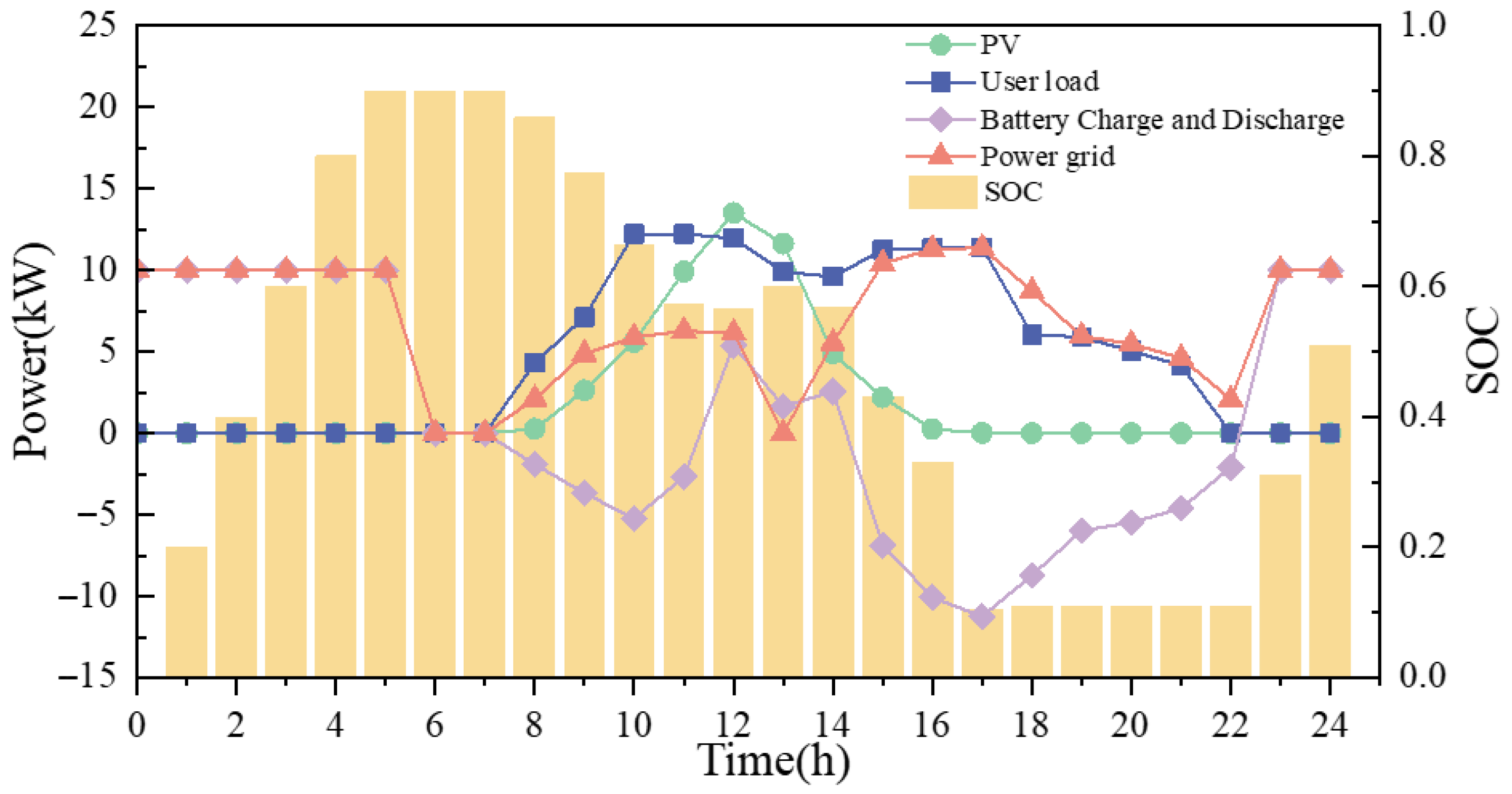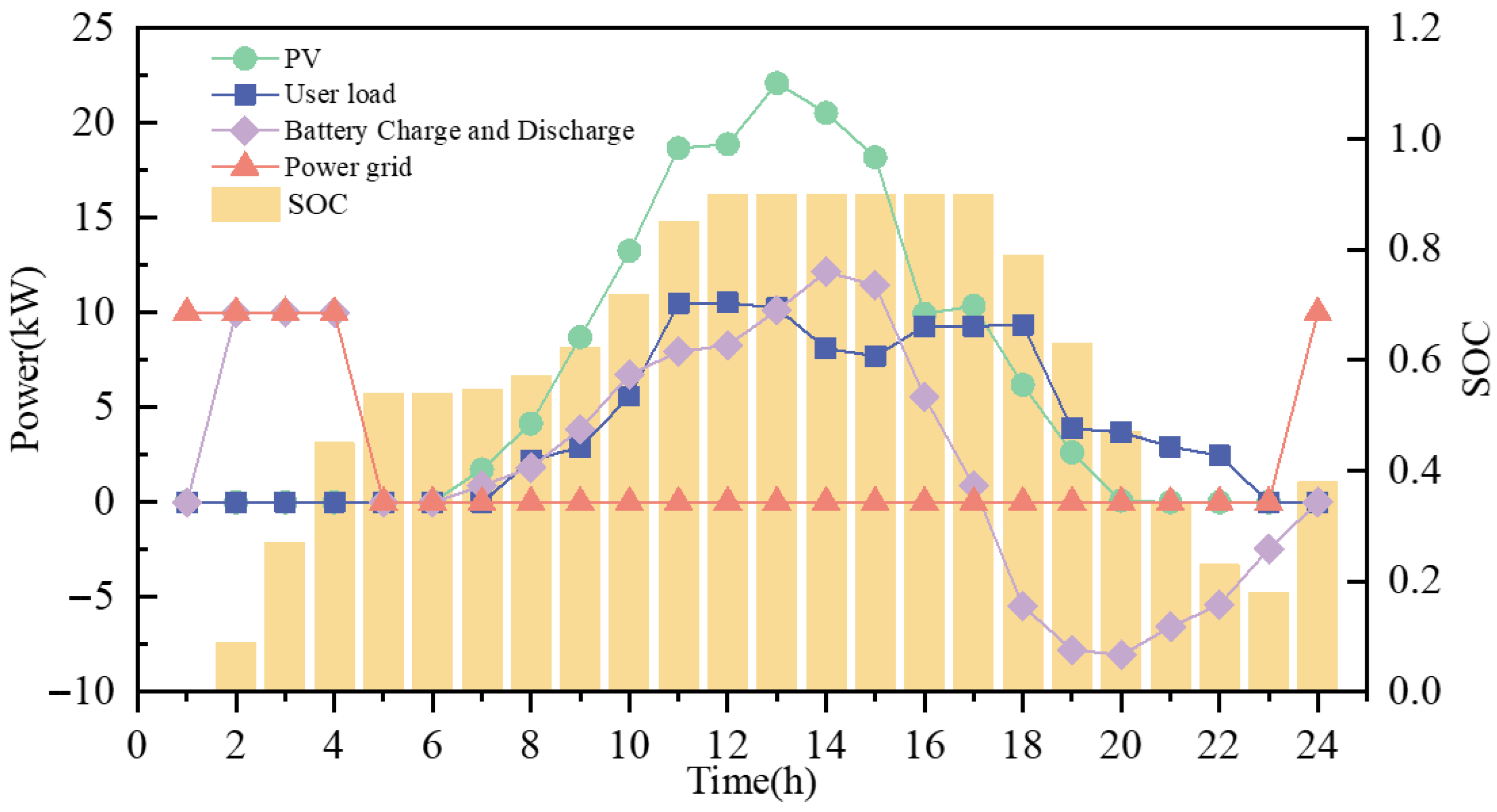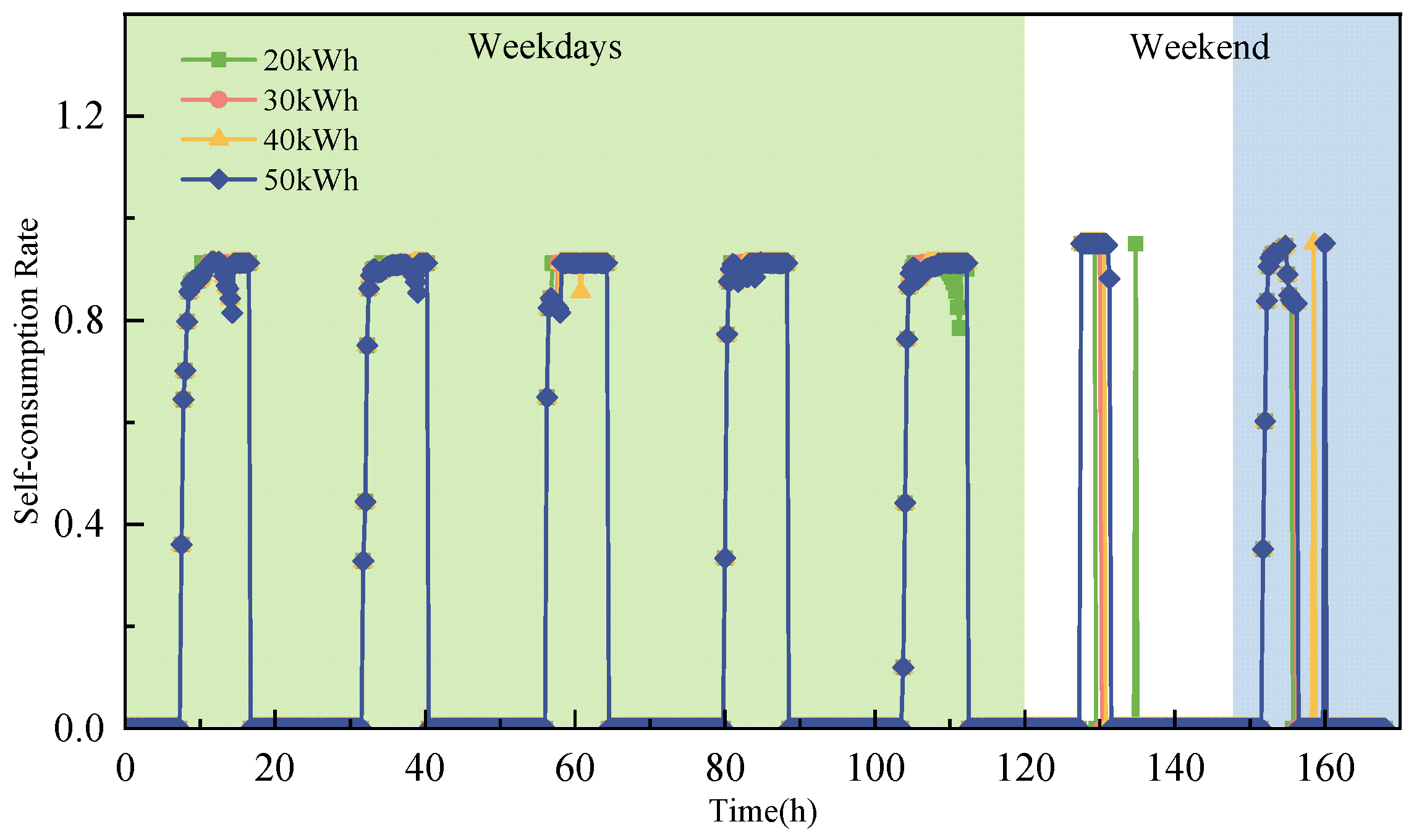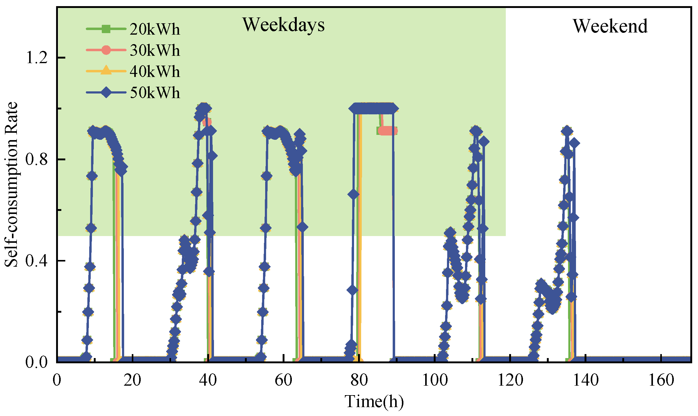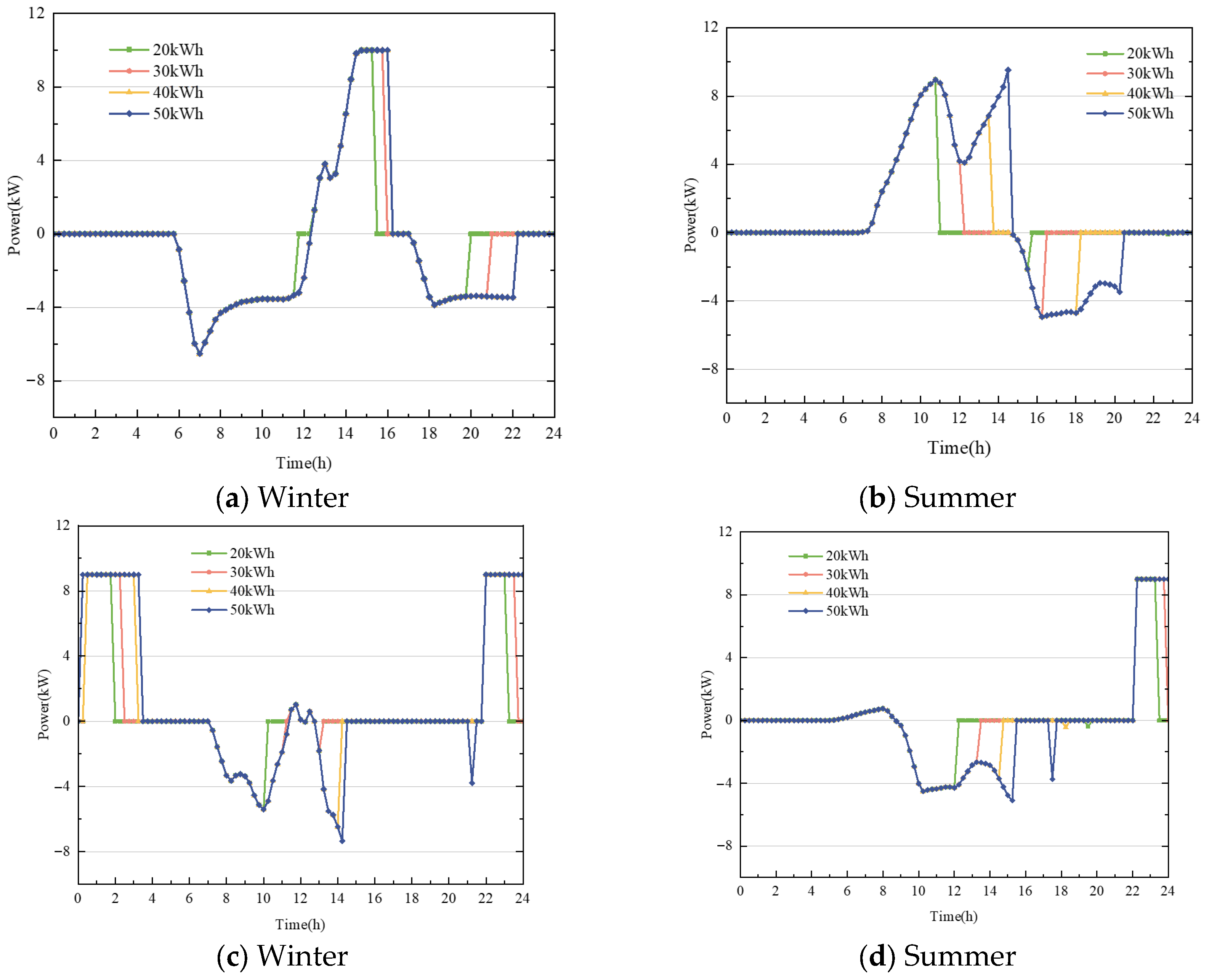 - Analysis of the ESS charge and discharge curves shows that the system’s responsiveness improves under the flexible energy management strategy. As ESS capacity increases, the system is better able to respond to fluctuations in PV power generation. The system’s ability to adapt and respond strengthens continuously, with the increase in storage capacity playing a vital role in enhancing system stability and regulatory capabilities.