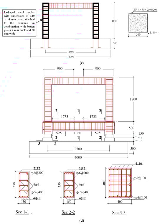 In this paper, four RC frame specimens were designed: one un-retrofitted RC frame, one frame retrofitted with RC jacketing, one frame retrofitted with steel jacketing; and one frame retrofitted with base isolation using LRBs. The specimens were designated F1, F2, F3, and F4, where F1 represents the un-retrofitted RC frame; F2 represents the frame retrofitted with an RC jacket; F3 represents the frame retrofitted with a steel jacket; and F4 represents the frame retrofitted with base isolation. Figure 1a shows the specimen design of the un-retrofitted RC frame, F1. The specimen was a half-scale frame representing the first floor of an actual five-story building. The column had a cross-sectional size of 300 mm × 300 mm and a height of 1800 mm. It was longitudinally reinforced with twelve HRB 400 bars, each 10 mm in diameter. The beam dimensions were 150 mm in width, 300 mm in height, and 2500 mm in length. The beam included five HRB 400 longitudinal bars, each 10 mm in diameter (two on the top and three on the bottom). In the RC and steel jacketing cases (i.e., specimens F2 and F3), only the columns were strengthened, and no additional strengthening was applied to the beams. Figure 1b,c show the details of the retrofitted specimens F2 and F3. For the specimen retrofitted with an RC jacket, the cross-sectional dimensions of each frame column were increased from the original 300 × 300 mm to 400 × 400 mm. For the specimen retrofitted with a steel jacket, L-shaped steel angles with dimensions of L40 × 4 mm were attached to the columns, in combination with batten plates 4 mm thick and 50 mm wide, spaced at 200 mm intervals.
