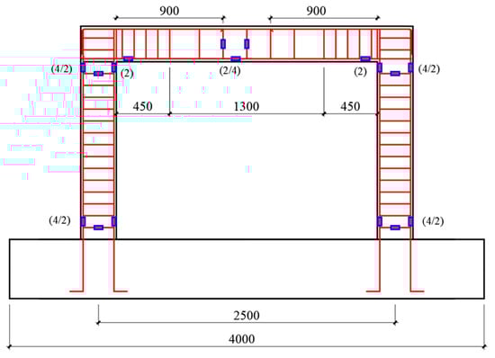 To accurately capture the stress state of each specimen during testing, strain gauges were installed on the longitudinal and stirrup reinforcement at the top and bottom of the columns, as well as at the beam ends and mid-spans at critical locations. For the base-isolated specimen, which included an additional transfer beam, strain gauges were also installed on the longitudinal reinforcement at the transfer beam ends and at the bottom of the mid-span. The layout of the strain gauge measurement points is shown in Figure 6.