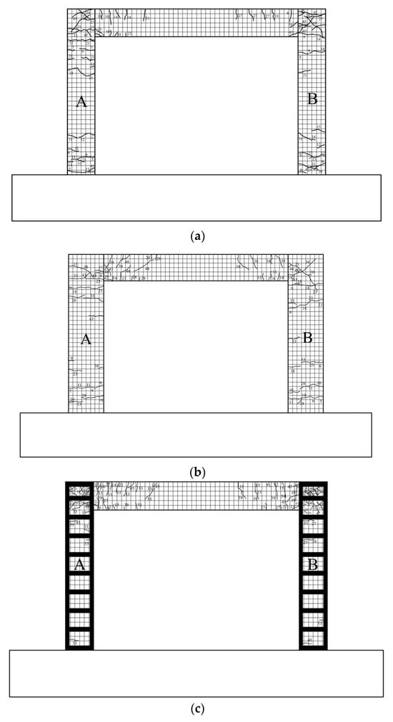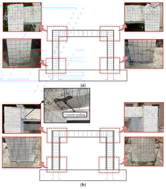 Figure 7 and Figure 8 present the final damage states of the four specimens at the end of testing and drawn crack patterns, respectively. Differences in damage patterns and failure modes among specimens were evident due to the varying retrofit techniques.