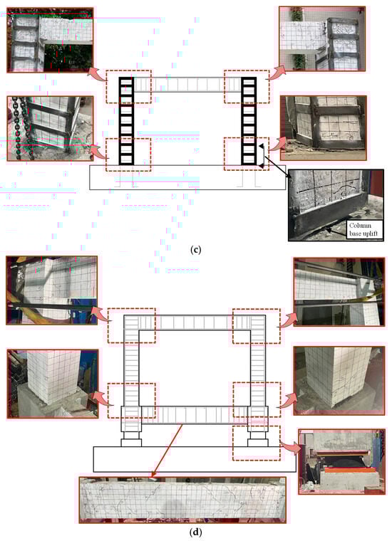 Final damage state of the specimens at different locations. (a) Specimen F1; (b) Specimen F2; (c) Specimen F3; (d) Specimen F4.