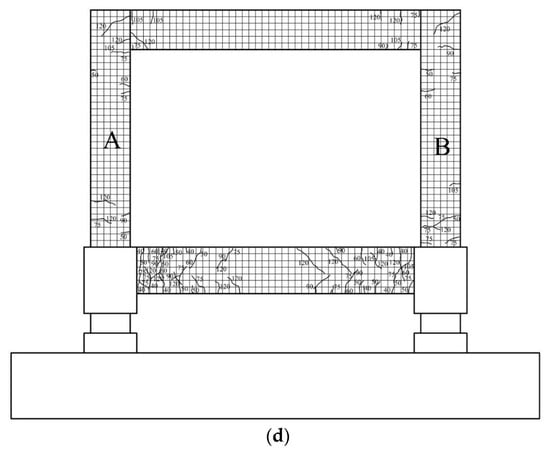 Drawn crack patterns of the specimens with respect to displacement (a) Specimen F1; (b) Specimen F2; (c) Specimen F3; (d) Specimen F4; (Note: A and B represent two columns of RC frames).