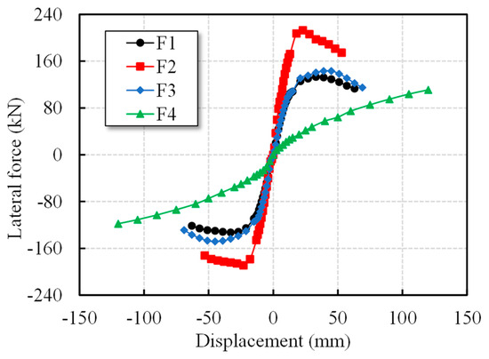 As seen in Figure 9, specimens F1, F2, and F3 exhibited similar bow-shaped hysteresis loops with slight pinching, indicating moderate stiffness degradation and stable but limited energy dissipation capacity. The hysteretic loops of the retrofitted specimens did not show significant pinching, owing to improved energy dissipation mechanisms, and the area enclosed by the loops increased with the applied displacement. Compared with the un-retrofitted specimen, RC jacketing (specimen F2) and steel jacketing (specimen F3) increased the maximum lateral strength in the positive direction by 59.86% and 7.56%, respectively. However, both retrofitted specimens experienced earlier stiffness degradation due to concentrated damage in the beams, which in turn reduced their cumulative energy dissipation at larger displacements. In contrast, the LRB-retrofitted specimen (F4) exhibited a full, shuttle-shaped hysteresis loop without noticeable pinching throughout the test. The superstructure remained undamaged, and the load-carrying capacity continued to increase even at larger displacements, owing to the isolation mechanism. It is noted that the observed performance trends provide comparative insights into different retrofitting strategies; however, variability in concrete properties, workmanship, and material imperfections may lead to differences in actual structural behavior.