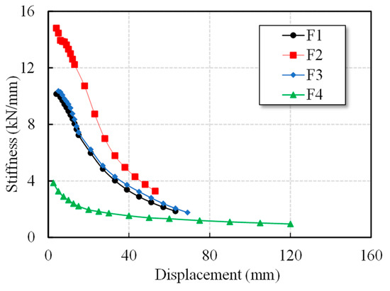 The stiffness degradation curves of each specimen are shown in Figure 12. Compared with the un-retrofitted specimen F1, the retrofitted specimens demonstrated varying levels of improvement. Specimen F2 exhibited the greatest increase in initial stiffness of 45.9%, and its degradation rate slowed noticeably, confirming the effectiveness of section enlargement in enhancing both stiffness and strength. The initial stiffnesses of F1 and F3 were nearly the same. However, specimen F3 achieved improved stiffness due to the lateral confinement provided by steel jacketing, which reduced the degradation rate compared with F1. In contrast, specimen F4 exhibited the lowest initial stiffness, at only 38% of specimen F1, because the isolation bearings primarily deform in shear. However, its stiffness degraded more gradually at larger displacement levels, underscoring the superior ductility and energy dissipation capacity of the base-isolated frame. Overall, the results indicate that RC jacketing is most effective in improving initial stiffness, while steel jacketing enhances stiffness retention during cyclic loading. Base isolation, although reducing the initial stiffness, provided the best performance in mitigating stiffness degradation at large deformations, thereby minimizing structural damage.