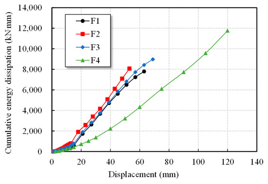 The energy dissipation-displacement relationships of the specimens are presented in Figure 13. It can be seen that the energy dissipation improved with the increase in the loading displacement. At the early loading stage, the energy dissipation of F1, F2, and F3 increased slowly with comparable values. Once the displacement reached the yield point, their dissipation capacities rose rapidly at similar rates. In the later loading stage, the growth rate of F1 and F3 declined due to stiffness degradation and damage accumulation. In contrast, F4 exhibited a slower rate of energy dissipation growth throughout loading. However, owing to the large deformation capacity of the LRB and its ability to absorb energy effectively, F4 achieved the highest energy dissipation at the end of the loading step. Compared with F1, the hysteretic energy dissipation of F2, F3, and F4 increased by 3.52%, 15.03%, and 50.78%, respectively. These results confirm that base isolation provides superior energy dissipation capacity compared with RC jacketing and steel jacketing.