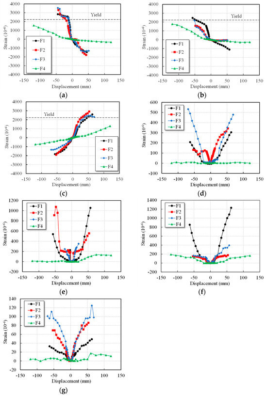 Rebar strains. (a) Longitudinal reinforcement at the bottom end of column; (b) Longitudinal reinforcement at the top end of column; (c) Longitudinal reinforcement at the end of beam; (d) Longitudinal reinforcement at the mid-span of beam; (e) Stirrups at the bottom end of column; (f) Stirrups at the top end of column; (g) Stirrups at the mid-span of beam.
