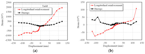 Beam reinforcement responses further highlighted the limitations of column-only strengthening (i.e., specimens F2 and F3). RC and steel jacketing accelerated yielding at the beam ends and increased mid-span reinforcement strains, which intensified cracking of concrete. Their beam stirrup strains also developed more rapidly than in the un-retrofitted specimen. By contrast, base isolation prevented beam reinforcement yielding, reduced both longitudinal and stirrup strains, and mitigated beam damage. Figure 15 shows the strain of the reinforcement in the transfer beam in specimen F4. As shown in Figure 15, transfer beam strains were concentrated at the beam ends, with almost yielding observed near failure. Specimen F4 exhibited high strains in the transfer beams, consistent with the observed sequence in which secondary members failed first a desirable mechanism for protecting primary components.
