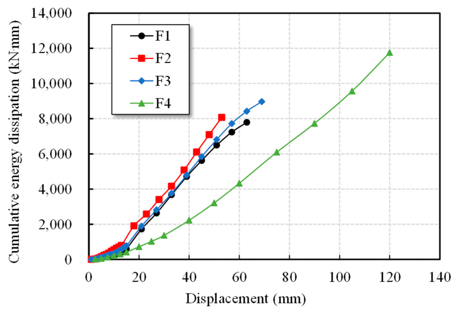 - The ductility coefficient decreased slightly under RC jacketing by 10.4% and under steel jacketing by 10.9%, indicating restricted plastic deformation. Conversely, base isolation improved ductility significantly, extending the ultimate deformation capacity by 90.6% compared with the un-retrofitted specimen. The hysteretic energy dissipation increased by 3.5% for RC jacketing, 15.0% for steel jacketing, and 50.8% for base isolation, compared with the un-retrofitted specimen. This confirms the superior capacity of base isolation to absorb seismic energy.