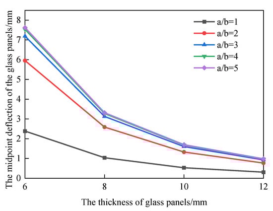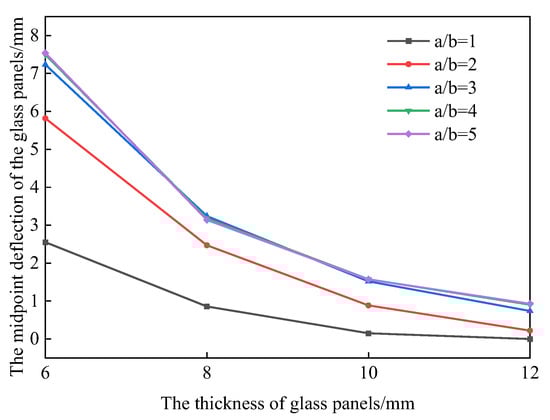 where is the uniformly distributed load (N/mm2). is the length of the long side (mm); is the length of the short side (mm); is the elastic modulus of the glass panel (N/mm2); is the minimum thickness of the glass panel (mm). The deformations of glass panels with different aspect ratios and thicknesses under a uniformly distributed load of 1 kPa are calculated in accordance with Equations (1)–(5), and the corresponding relationship shown in Figure 2 can be obtained.