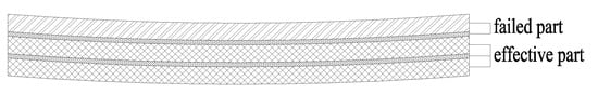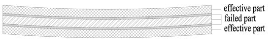 It should be noted that although the self-explosion risk of tempered glass can be significantly reduced through heat soaking treatment, there is still a risk of breakage in actual service. Therefore, the adverse working condition of single-layer glass breakage shall be incorporated into the calculation model. At this point, the stress and deflection of the glass panel shall meet the design requirements under short-term load action, to ensure that the glass does not completely lose its load-bearing capacity after breakage. After glass breakage, it can be determined that the broken glass and its adjacent interlayer film lose their load-bearing capacity; the effective force-bearing part is shown in Figure 5 and Figure 6.