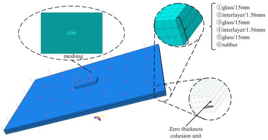 Glass is treated as a linear elastic body, while interlayers, tires, and rubber supports all adopt the Mooney–Rivlin constitutive model. To simulate the adhesion between glass and interlayers, a zero-thickness cohesive element (COH3D8) is inserted between them, and the bilinear intrinsic cohesive material model is adopted—with parameters such as the strength and fracture energy of glass material as the main variables. The material parameters are shown in Table 5.