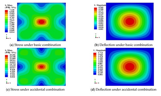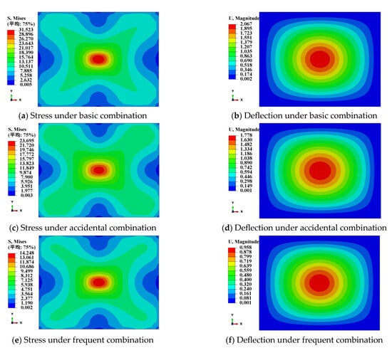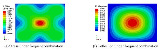 The contour diagrams of stress and deflection of PVB and SGP laminated glass bridge decks under different load combinations are shown in Figure 9 and Figure 10.