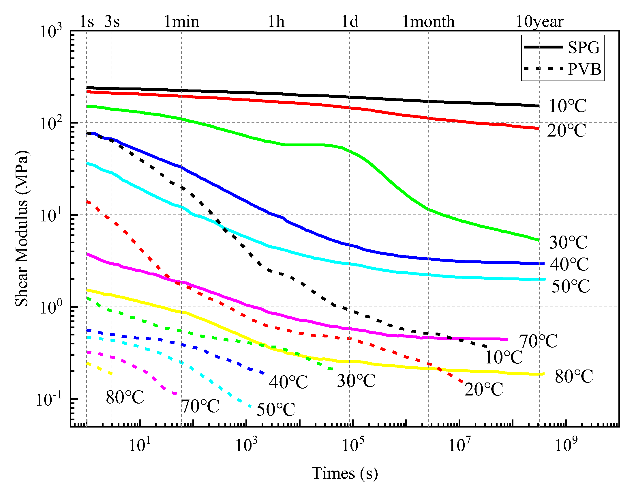 Figure 1 shows the changes in shear modulus of PVB and SGP over time under different temperature conditions [
