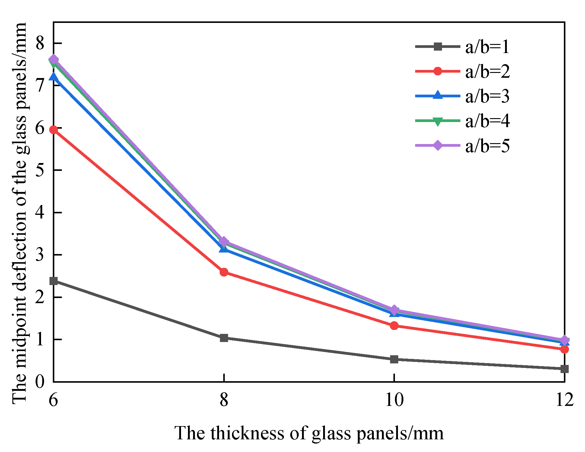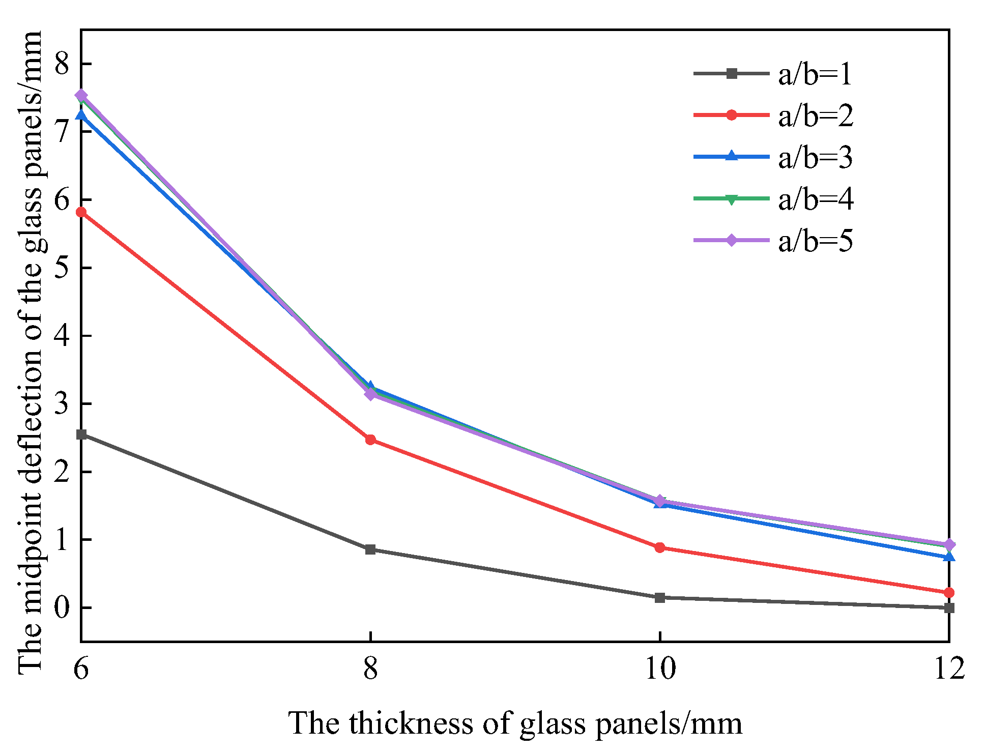 17] refer to the relationship between the thickness of glass panels and the midpoint deflection. Considering the influence of glass nonlinear deformation, ASTM E1300-16 establishes a mathematical relationship between the thickness, aspect ratio, and midpoint deflection of glass panels with four-sided support through polynomial curve fitting: