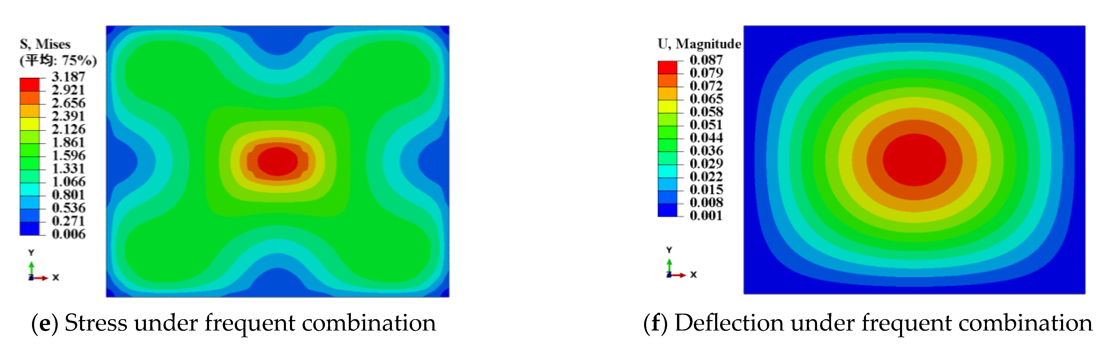 (4) This study calculated the engineering example based on the thin-plate large-deflection calculation theory, and the calculation results showed good agreement with the numerical simulation results. The results indicate that both PVB and SGP-laminated glass can meet the load-bearing capacity requirements, but SGP-laminated glass has a larger safety redundancy; after single-layer glass breakage, the bridge deck still has sufficient load-bearing capacity. The calculation results of the design method are slightly more conservative than those of the finite element calculation, but the method is more accurate in calculating the stress and deflection of SGP-laminated glass.