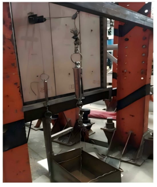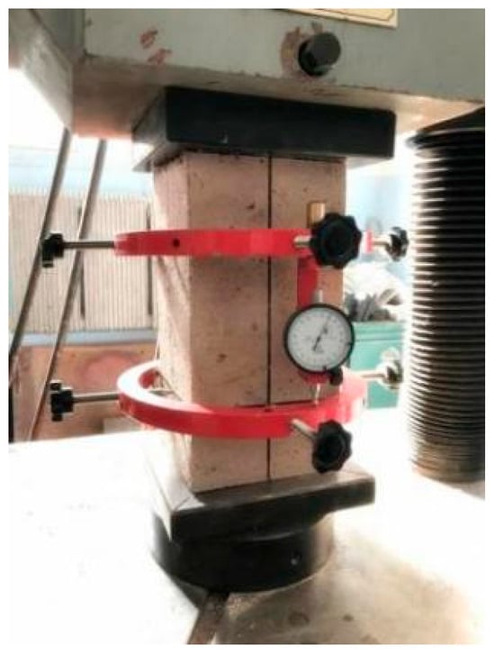 Six 150 × 150 × 300 mm test blocks were taken at a curing age of 28 days. Three of them were used to test the axial compressive strength, and the other three were used to test the elastic modulus of static compression. The test processes are shown in Figure 3 and Figure 4. In the test, the lower part adopted the ball hinge + steel plate to support the test block. Before loading, the upper loading steel plate of the test machine was adjusted to 5–10 mm on the top surface of the test block to ensure that the test block was centered, and the test was started.
