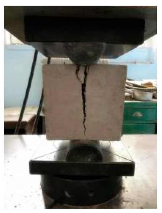 After the curing age of the test blocks reached 28 days, three 150 × 150 × 150 mm test blocks were taken to carry out the splitting tensile strength test, as shown in Figure 5. According to the measured data, the splitting tensile strengths of the three test blocks were calculated to be 1.84 MPa, 1.66 MPa, and 1.78 MPa, respectively, with an average of 1.76 MPa.