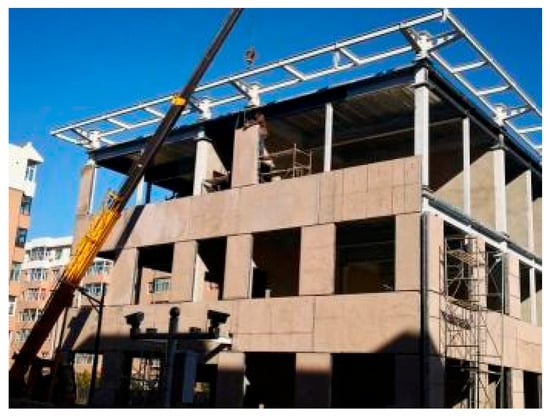 A demonstration project in Datong City, Shanxi Province, located in the northern cold region, was considered. This building was intended to function as a community office and activity center. According to the standard [], an external wall can meet the energy-saving requirements of public buildings in a cold C area when 30 mm thick B1 flame-retardant extruded polystyrene board and 120 mm thick rock wool are used. Therefore, between two 20 mm thick SC coal gangue panels, a 120 mm thick layer of rock wool was inserted. The SC coal gangue composite wallboard is composed of a keel, SC coal gangue panel and rock wool. The arrangement of the keel is shown in Figure 20, and the keels are welded together to form a whole. The connection between the panel and the keel is shown in Figure 11. Rock wool is embedded in the cavity formed by the SC coal gangue panel and keel. The SC coal gangue composite wallboards were prefabricated in the factory. After installation of the composite wallboard was completed, a 30 mm thick polystyrene board and real stone paint wall surface were added on site. The heat transfer coefficient of the coal gangue board composite rock wool was reduced from 0.47 to 0.31 , a decrease of 34.0%, air sound insulation was , and the self-weight of the external wallboard was reduced by 37.5%, so the related performance was better than the requirements of the current standard. The schematic of the wallboard composite method is shown in Figure 20, taking WSQ-9 as an example.